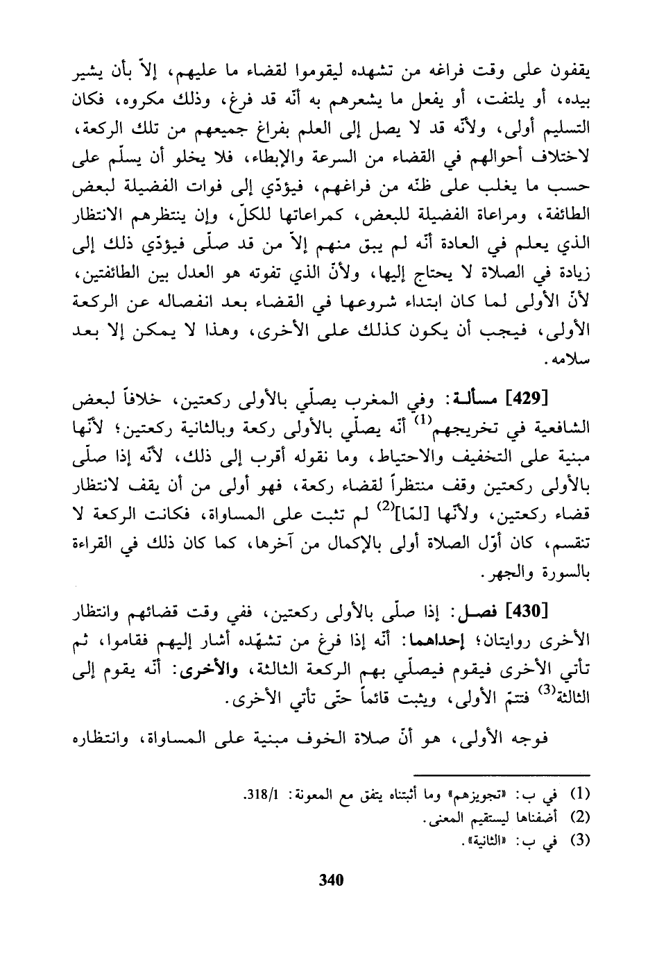 يقفون على وقت فراغه من تشهده ليقوموا لقضاء ما عليهم، إلا بأن يشير بيده، أو يلتفت أو يفعل ما يشعرهم به أنه قد فرغ، وذلك مكروه، فكان التسليم أولى، ولأنه قد لا يصل إلى العلم بفراغ جميعهم من تلك الركعة، لاختلاف أحوالهم في القضاء من السرعة والإبطاء، فلا يخلو أن يسلم على حسب ما يغلب على ظنه من فراغهم، فيؤدي إلى فوات الفضيلة لبعض الطائفة، ومراعاة الفضيلة للبعض، كمراعاتها للكل، وأن ينتظرهم الانتظار الذي يعلم في العادة أنه لم يبق منهم إلا من قد صلى فيؤدي ذلك إلى زيادة في الصلاة لا يحتاج إليها، ولأن الذي تفوته هو العدل بين الطائفتين؛ لأن الأولى لما كان ابتداء شروعها في القضاء بعد انفصاله عن الركعة الأولى، فيجب أن يكون كذلك على الأخرى، وهذا لا يمكن إلا بعد سلامه.