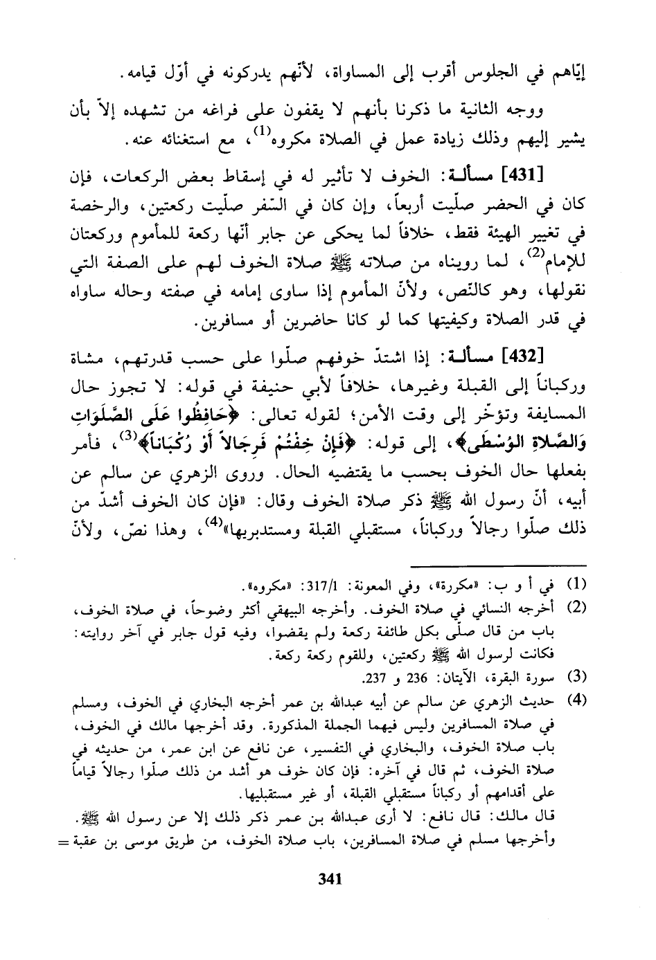[431] مسألة: الخوف لا تأثير له في إسقاط بعض الركعات، فإن كان في الحضر صليت أربعاً وإن كان في السفر صليت ركعتين، والرخصة في تغيير الهيئة فقط. خلافاً لما يحكى عن جابر أنها ركعة للمأموم وركعتان للإمام، لما رويناه من صلاته - صلى الله عليه وسلم - صلاة الخوف لهم على الصفة التي نقلوها وهو كالنص. ولأن المأموم إذا ساوى إمامه في صفته وحاله ساواه في قدر الصلاة وكيفيتها كما لو كانا حاضرين أو مسافرين.