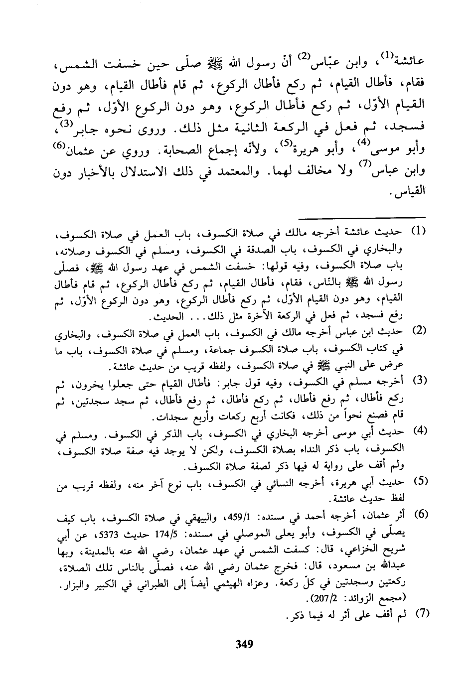 عائشة، وابن عباس أن رسول الله - صلى الله عليه وسلم - صلى حين كسفت الشمس، فقام، فأطال القيام، ثم ركع، فأطال الركوع، ثم قام فأطال القيام، وهو دون القيام الأول، ثم ركع، فأطال الركوع وهو دون الركوع الأول، ثم رفع فسجد، ثم فعل في الركعة الثانية مثل ذلك). وروى نحوه جابر، وأبو موسى، وأبو هريرة ولأنه إجماع الصحابة، وروي عن عثمان، وابن عباس ولا مخالف لهما، والمعتمد في ذلك الاستدلال بالأخبار دون القياس.