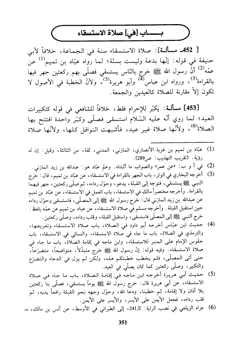 [452] صلاة الاستسقاء سنة في الجماعة. خلافاً لأبي حنيفة في قوله إنها بدعة وليست بسنة لما رواه عباد بن تميم، عن عمه أن رسول الله - صلى الله عليه وسلم - خرج بالناس يستسقي فصلى بهم ركعتين جهر فيهما بالقراءة) ورواه ابن عباس، وأبو هريرة، ولأن الخطبة في الأصول لا تكون إلا مقارنة للصلاة كالعيدين والجمعة.