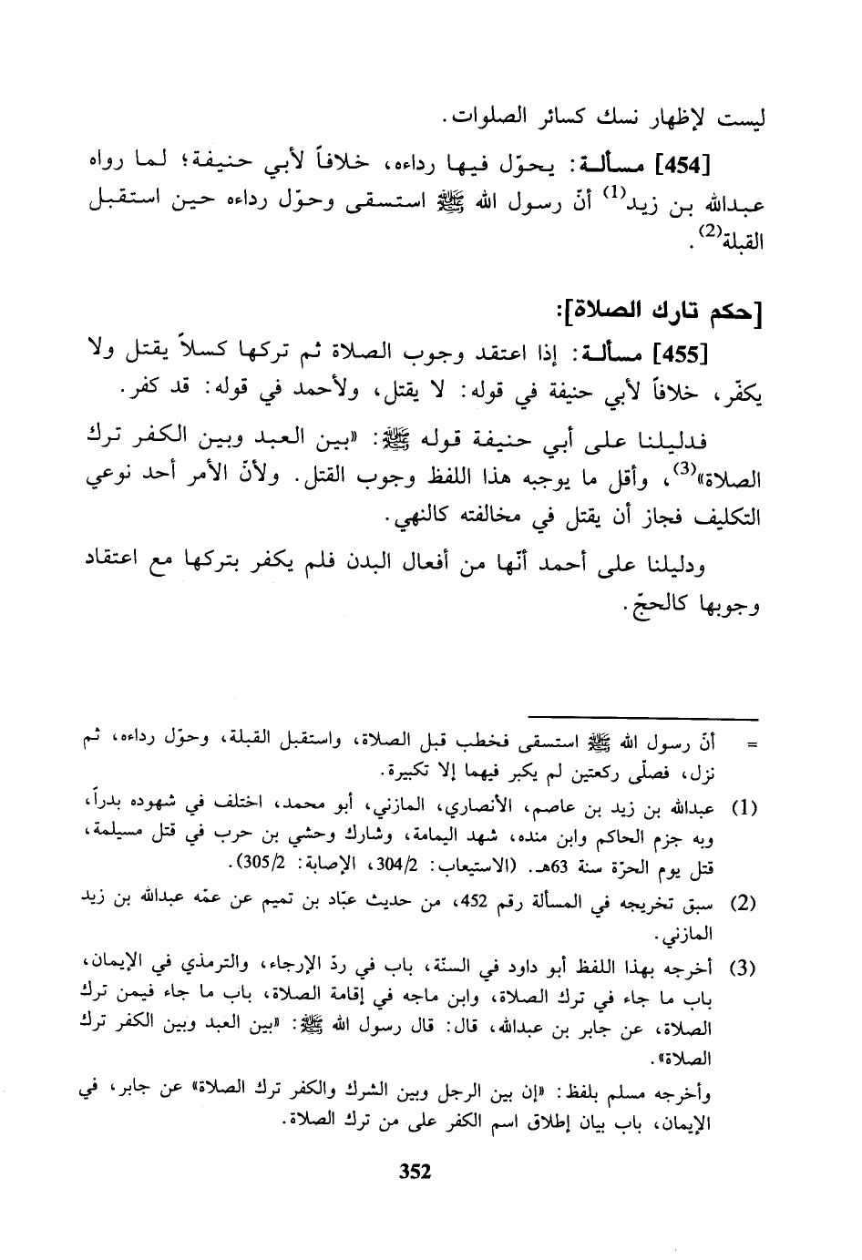 [455] مسألة: إذا اعتقد وجوب الصلاة ثم تركها كسلا يقتل ولا يكفر، خلافاً لأبي حنيفة في قوله لا يقتل، ولأحمد في قوله قد كفر.