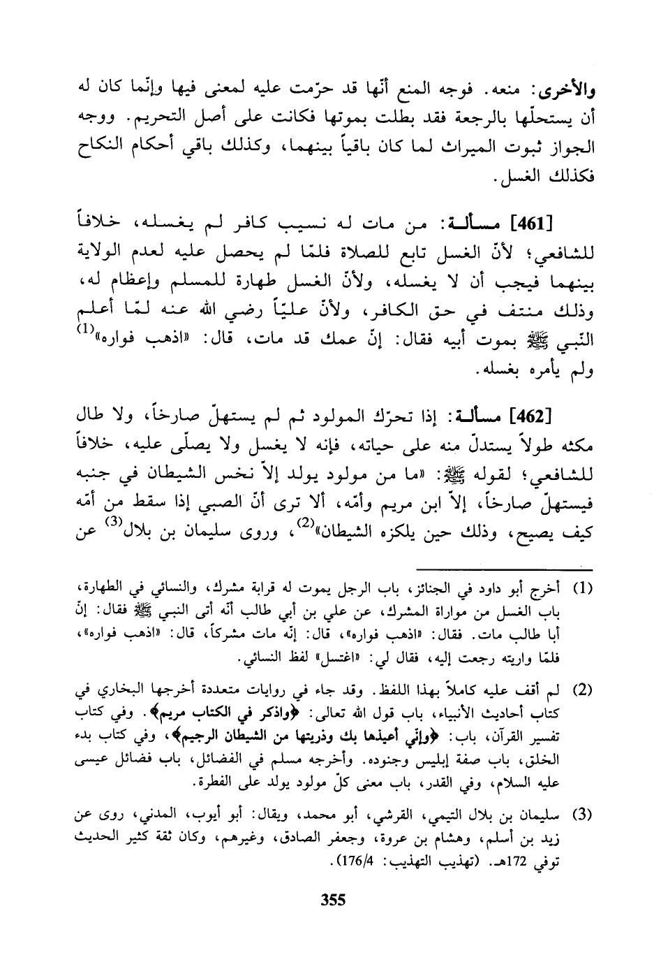 [462] مسألة: إذا تحرك المولود ثم لم يستهل صارخا ولا طال مكثه طولاً يستدل منه على حياته فإنه لا يغسل ولا يصلى عليه، خلافاً للشافعي. لقوله - صلى الله عليه وسلم -: (ما من مولود يولد إلا نخس الشيطان في جنبه فيستهل صارخاً، إلا ابن مريم وأمه ألا ترى أن الصبي إذا سقط من أمه كيف يصيح؟ وذلك حينَ يلكُزُه الشيطان).وروى سليمان بن بلال،