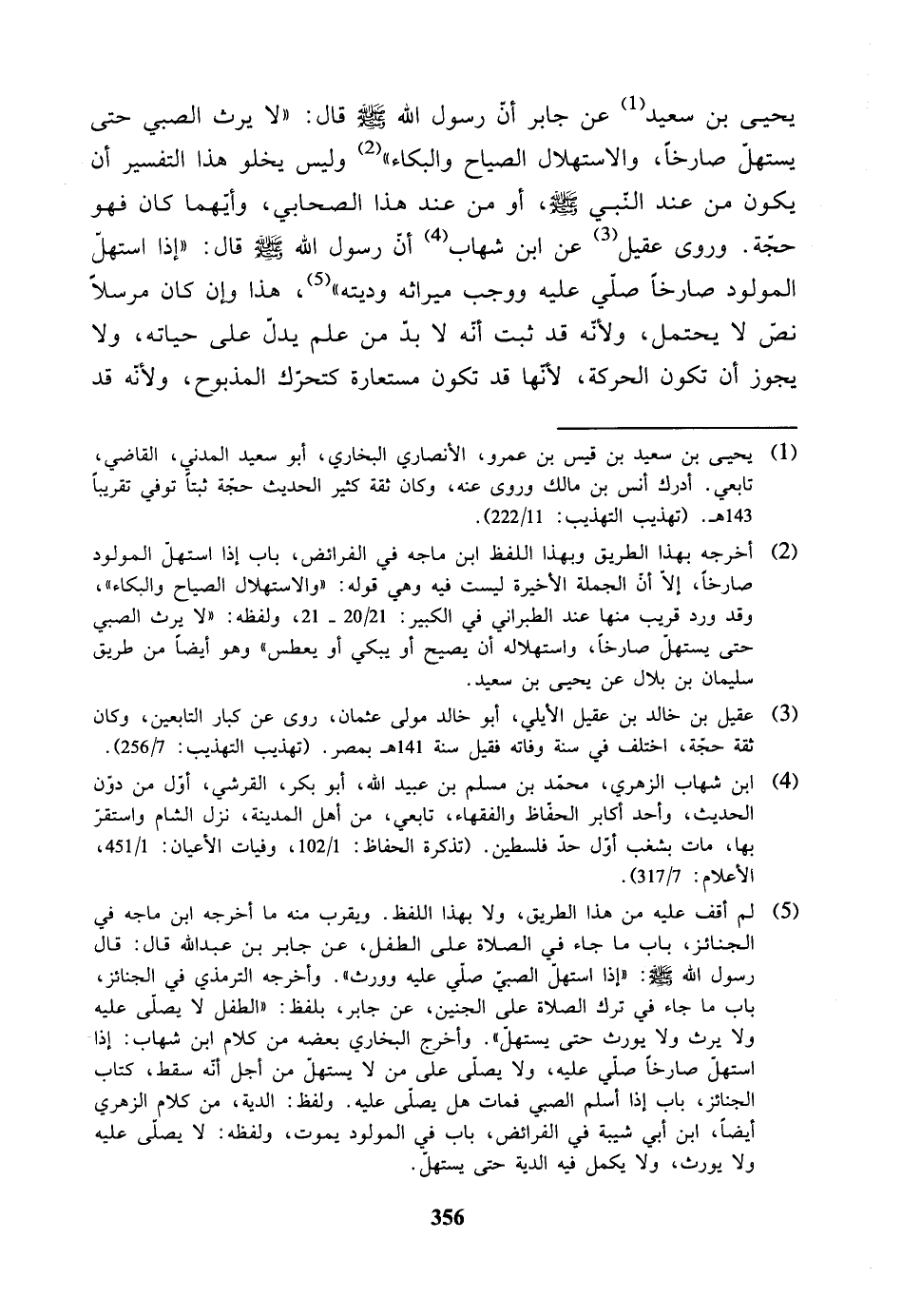 عن يحيى بن سعيد، عن جابر أن رسول الله - صلى الله عليه وسلم - قال: (لا يرث الصبي حتى يستهل صارخاً)، والاستهلال الصياح والبكاء، وليس يخلو هذا التفسير أن يكون من عند النبي - صلى الله عليه وسلم -، أو من عند هذا الصحابي، وأيهما كان فهو حجة. وروى عقيل، عن ابن شهاب أن رسول الله - صلى الله عليه وسلم - قال: (إذا استهل المولود صارخاً صُلّي عليه، ووجب ميراثه وديته). هذا وإن كان مرسلاً نص لا يحتمل. ولأنه قد ثبت أنه لا بد من علم يدل على حياته ولا يجوز أن تكون الحركة: لأنها قد تكون مستعارة كتحرك المذبوح ولأنه قد