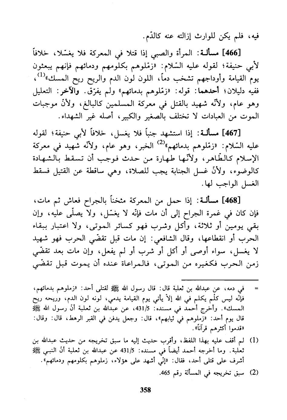 [466] مسألة: المرأة والصبي إذا قتلا في المعركة فلا يغسلان،. خلافاً لأبي حنيفة. لقوله عليه السلام: (زملوهم بكلومهم ودمائهم، فإنهم يبعثون يوم القيامة وأوداجهم تشخب دماً اللون لون دم والريح ريح المسك)، ففيه دليلان: أحدهما: قوله (زملوهم بدمائهم) ولم يفرق والأخر: التعليل وهو عام. ولأنه شهيد بالقتل في معركة المسلمين كالبالغ، ولأن موجبات الموت من العبادات لا تختلف بالصغير والكبير، أصله غير الشهداء.