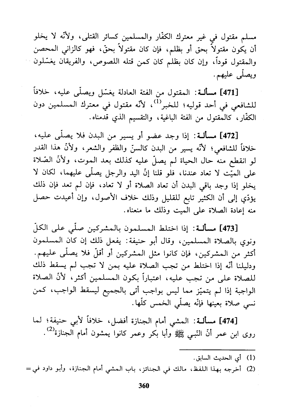 [474] مسألة: المشي أمام الجنازة أفضل. خلافاً لأبي حنيفة لما روى ابن عمر أن النبي - صلى الله عليه وسلم - وأبا بكر وعمر كانوا يمشون أمام الجنازة.