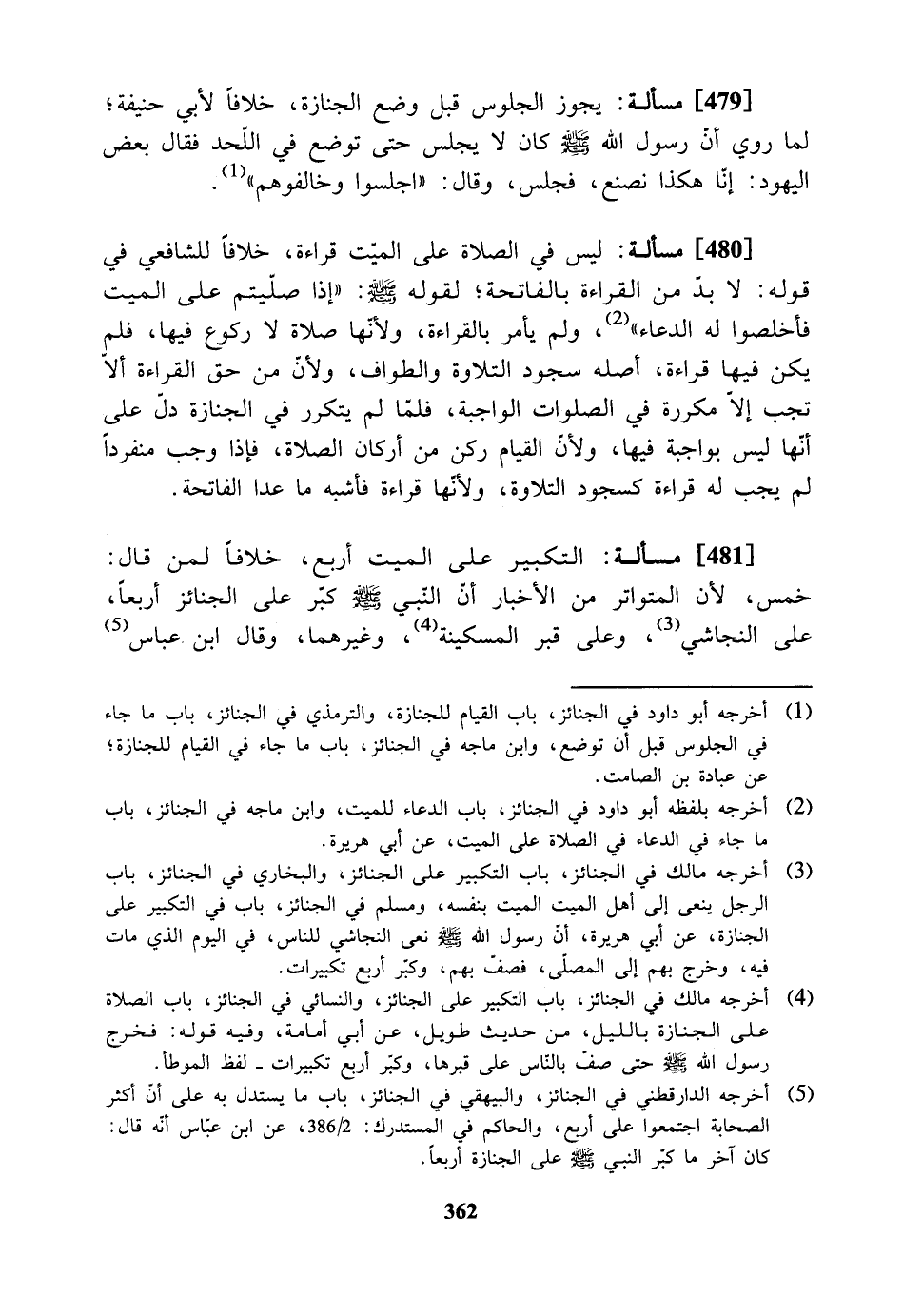 [481] مسألة: التكبير على الميت أربع، خلافاً لمن قال خمس، لأن المتواتر من الأخبار أن النبي - صلى الله عليه وسلم - كبر على الجنائز أربعاً على النجاشي، وعلى قبر المسكينة، وغيرهما، وقال: ابن عباس