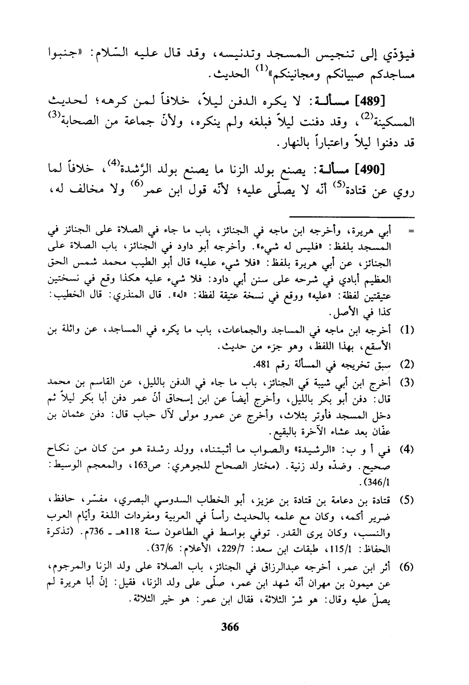[489] مسألة: لا يكره الدفن ليلاً خلافاً، لمن كرهه، لحديث المسكينة وقد دفنت ليلاً فبلغه ولم ينكره، ولأن جماعة من الصحابة قد دفنوا ليلاً واعتباراً بالنهار.