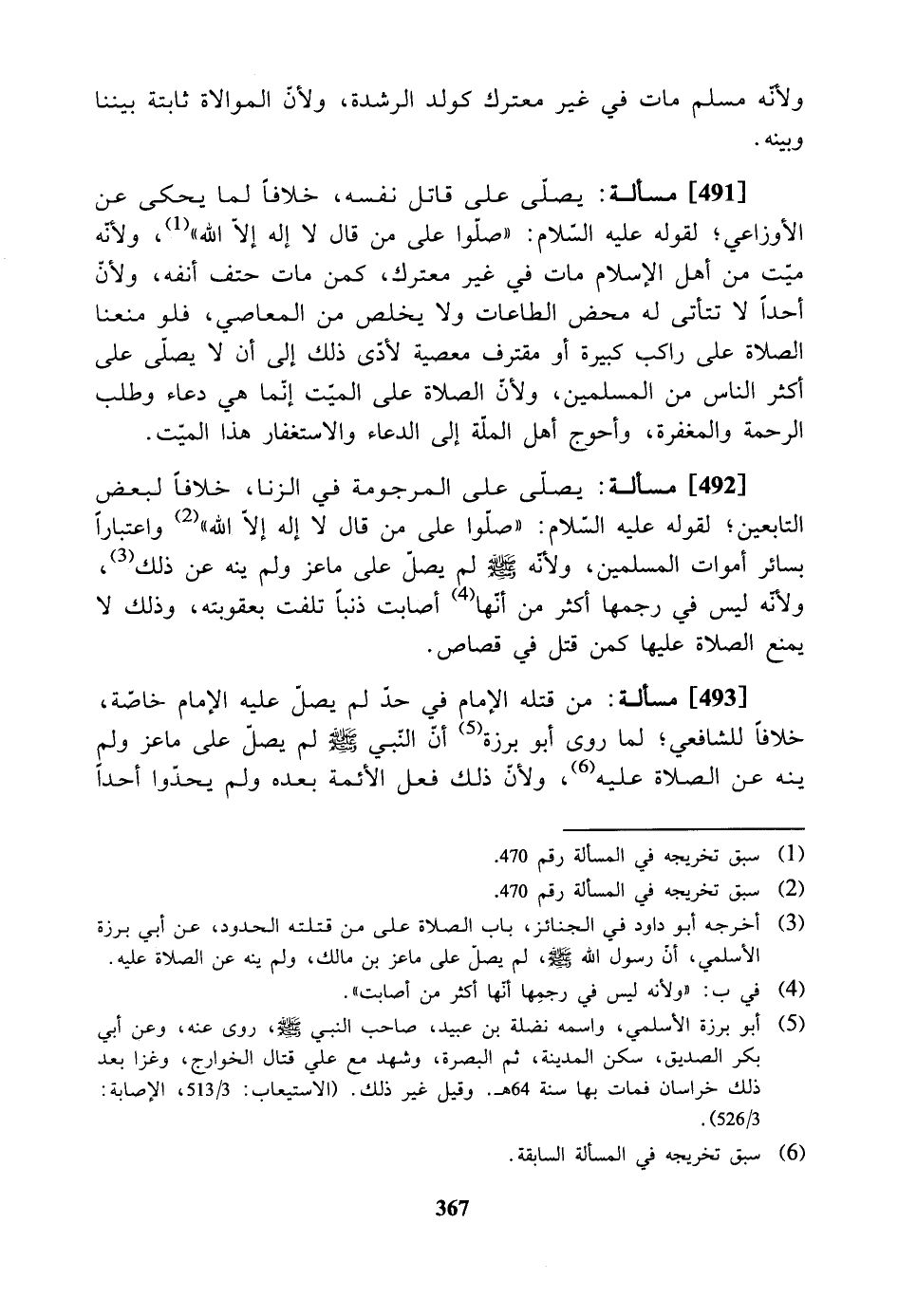 [493] مسألة: من قتله الإمام في حد لم يصل عليه الإمام خاصة خلافاً للشافعي. لما روى أبوبرزة أن النبي - صلى الله عليه وسلم - لم يصل على ماعز ولم ينه عن الصلاة عليه.