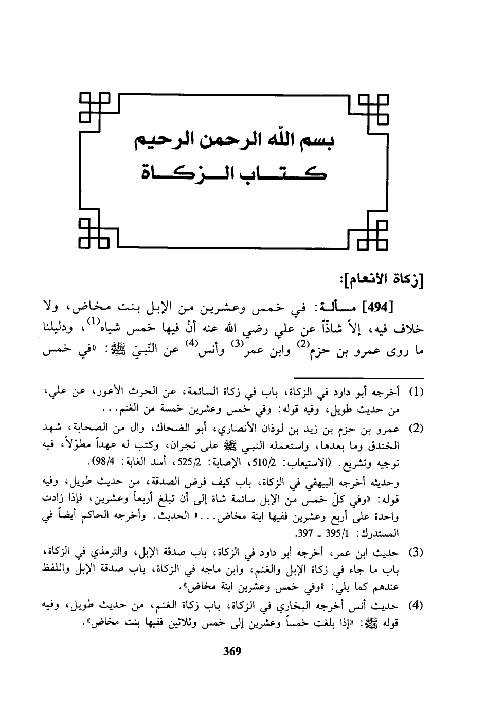 [494] مسألة: في خمس وعشرين من الإبل بنت مخاض، ولا خلاف فيه، إلا شاذاً، عن علي - رضي الله عنه -، أن فيها خمس شياه، ودليلنا ما روى عمرو بن حزم، وابن عمر، وأنس عن النبي - صلى الله عليه وسلم -: (في خمس