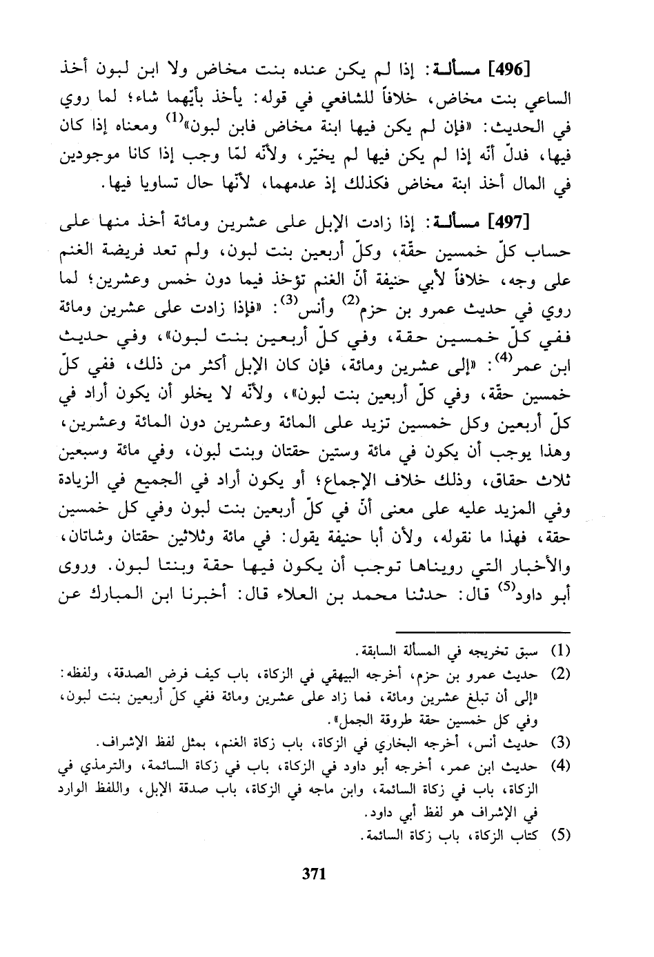 [497] مسألة: إذا زادت الإبل على عشرين ومائة أخذ منها على حساب كل خمسين حقة، وكل أربعين بنت لبون، ولم تعد فريضة الغنم على وجه. خلافاً لأبي حنيفة أن الغنم تؤخذ فيما دون خمس وعشرين، لما روي في حديث عمرو بن حزم، وأنس (فإذا زادت على عشرين ومائة ففي كل خمسين حقة، وفي كل أربعين بنت لبون). وفي حديث ابن عمر (إلى عشرين ومائه، فإن كان الإبل أكثر من ذلك ففي كل خمسين حقة، وفي كل أربعين بنت لبون). ولأنه لا يخلو أن يكون أراد في كل أربعين وكل خمسين تزيد على المائة وعشرين دون المائة وعشرين، وهذا يوجب أن يكون في مائة وستين حقتان وبنت لبون، وفي مائة وسبعين ثلاث حقاق، وذلك خلاف الإجماع، أو يكون أراد في الجميع في الزيادة وفي المزيد عليه على معنى أن في كل أربعين بنت لبون وفي كل خمسين حقة، فهذا ما نقوله. ولأن أبا حنيفة يقول في مائة وثلاثين حقتان وشاتان، والأخبار التي رويناها توجب أن يكون فيها حقة وبنتا لبون، وروى أبو داود قال: حدثنا محمد بن العلاء قال أخبرنا ابن المبارك عن