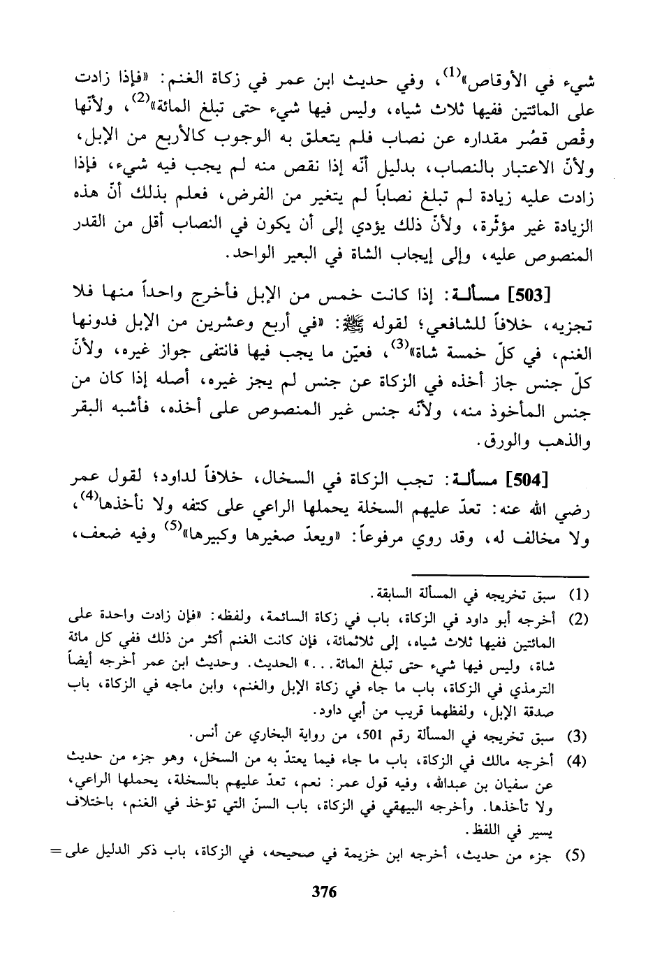 [504] مسألة: تجب الزكاة في السخال خلافاً لداود، لقوله عمر - رضي الله عنه -: (تعد عليهم السخلة يحملها الراعي على كتفه ولا نأخذها) ولا مخالف له، وقد روى مرفوعاً: (ويعد صغيرها وكبيرها) وفيه ضعف،
