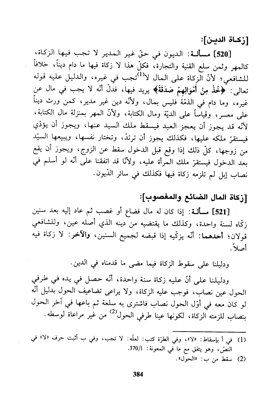 [521] مسألة: إذا كان له مال فضاع أو غصب ثم عاد إليه بعد سنين زكاه لسنة واحدة، وكذلك ما يقتضيه من دينه الذي أصله عين، وللشافعي قولان: أحدهما: أنه يزكيه إذا قبضه لجميع السنين.