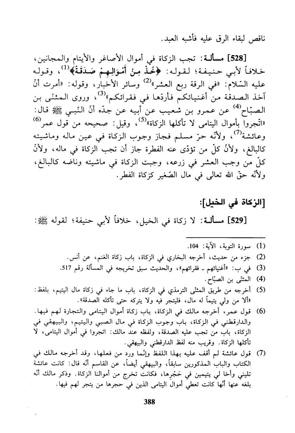 [528] مسألة: تجب الزكاة في أموال الأيتام والأصاغر والمجانين. خلافاً لأبي حنيفة؛ لقوله تعالى: {خذ من أموالهم صدقة}، وقوله عليه السلام: (في الرقة ربع العشر) وسائر الأخبار، وقوله: (أمرت أن آخذ الصدقة من أغنيائكم فأردها على فقرائكم)، وروى المثنى بن الصباح، عن عمرو بن شعيب عن أبيه، عن جده، أن النبي - صلى الله عليه وسلم - قال: (اتجروا بأموال اليتامى لا تأكلها الزكاة) وقيل: صحيحه من قول عمر وعائشة، ولأنه حر مسلم فجاز وجوب الزكاة في عين ماله وماشيته كالبالغ؛ ولأن كل من تؤدى عنه الفطرة جاز أن تجب الزكاة في ماله، ولأن كل من وجب العشر في زرعه، وجبت الزكاة في ماشيته وناضه كالبالغ؛ ولأنه حق الله في مال الصغير كزكاة الفطر.