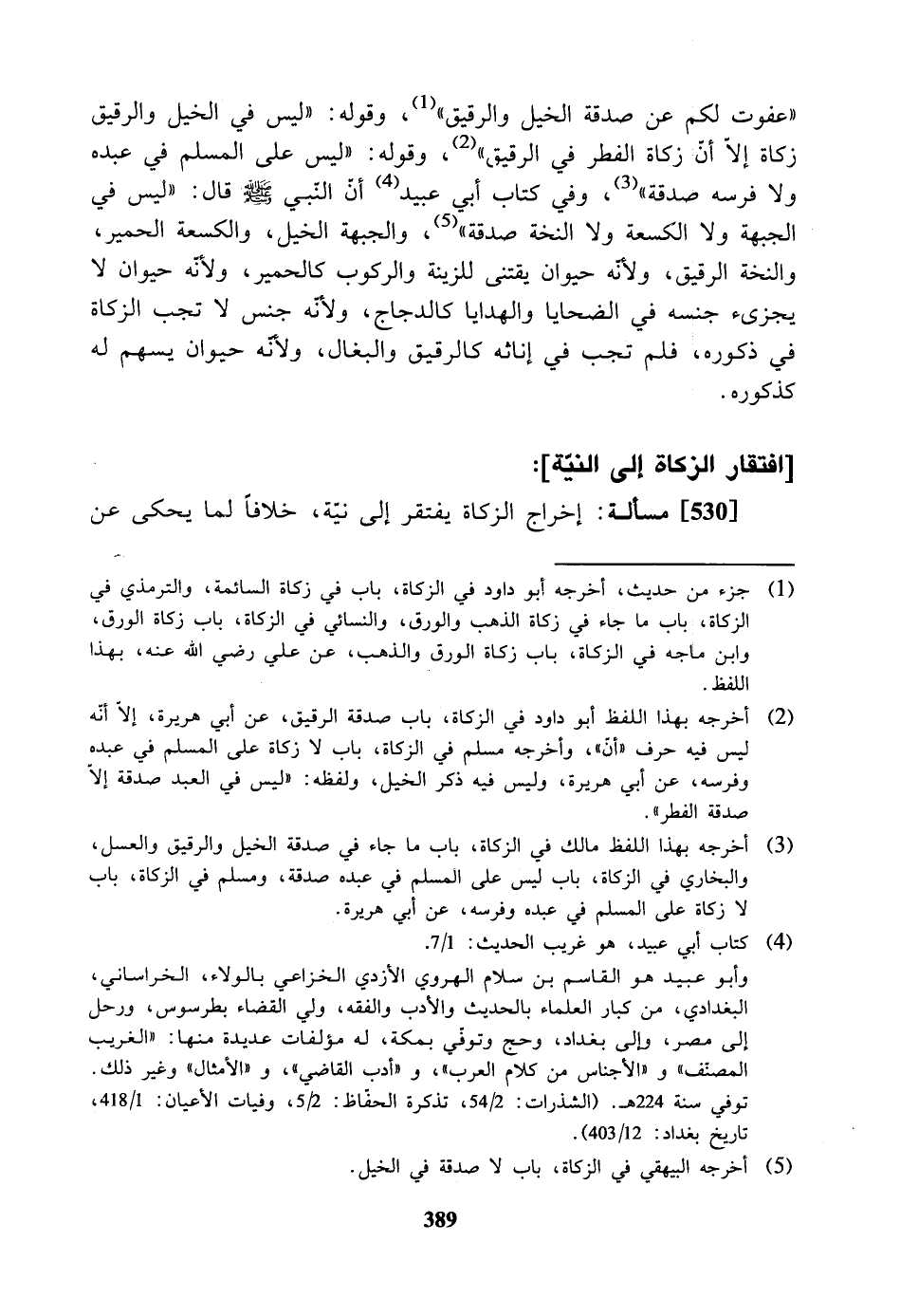 (عفوت لكم عن صدقة الخيل والرقيق) وقوله: (ليس في الخيل والرقيق زكاة إلا أن زكاة الفطر في الرقيق) وقوله: (ليس على المسلم في عبده ولا فرسه صدقة) وفي كتاب أبي عبيد أن النبي - صلى الله عليه وسلم - قال: (ليس في الجبهة ولا الكسعة ولا النخّة صدقة) والجبهة الخيل