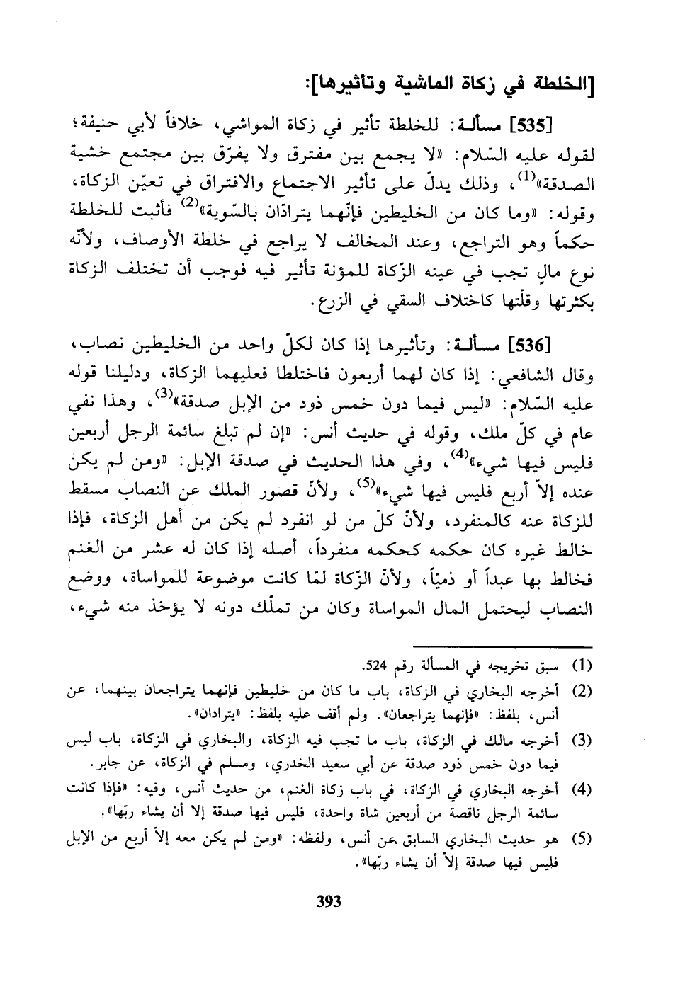 [535] مسألة: للخلطة تأثير في زكاة المواشي. خلافاً لأبي حنيفة، لقوله عليه السلام: (لا يجمع بين مفترق، ولا يفرق بين مجتمع خشية الصدقة)، وذلك يدل على تأثير الاجتماع والافتراق في تعيين الزكاة، وقوله: (وما كان من الخليطين فإنهما يترادان بالسوية)، فأثبت للخلطة حكما وهو التراجع، وعند المخالف لا يراجع في خلطة الأوصاف؛ ولأنه نوع مال تجب في عينه الزكاة للمؤونة تأثير فيه فوجب أن تختلف الزكاة بكثرتها وقلتها كاختلاف السقي في الزرع.
