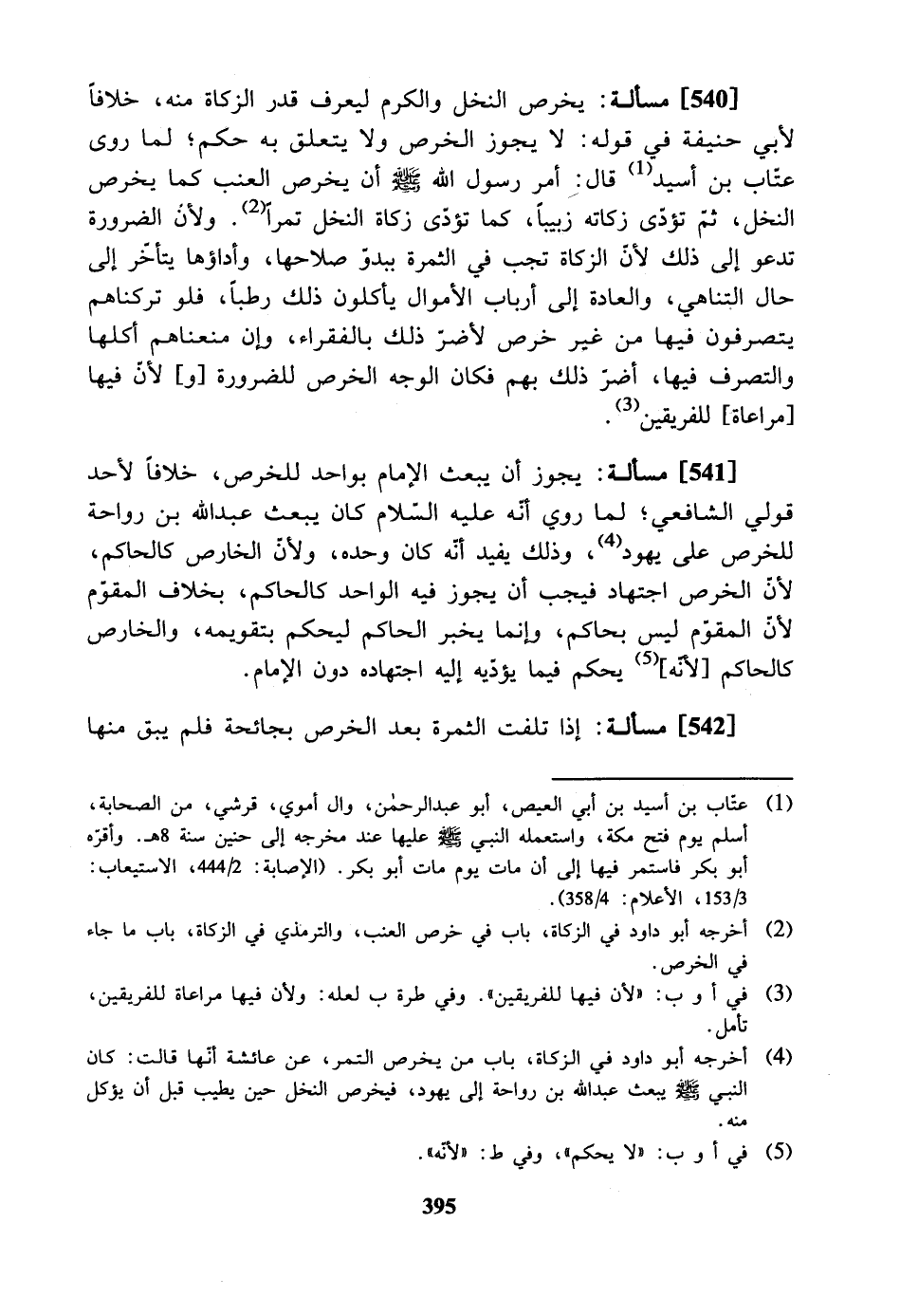 [541] مسألة: يجوز أن يبعث الإمام بواحد للخرص. خلافاً لأحد قولي الشافعي، لما روي أنه عليه السلام (كان يبعث عبدالله بن رواحة للخرص على يهود) وذلك يفيد أنه كان وحده؛ ولأن الخارص كالحاكم؛ لأن الخرص اجتهاد، فيجب أن يجوز فيه الواحد كالحاكم، بخلاف المقوم؛ لأن المقوم ليس بحاكم، وإنما يخبر الحاكم ليحكم بتقويمه، والخارص كالحاكم؛ لأنه يحكم فيما يؤديه إليه اجتهاده دون الإمام.