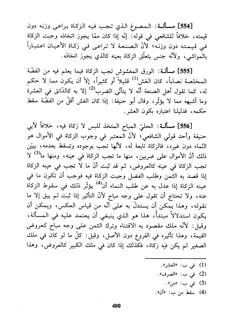 [556] مسألة: الحلي المباح المتخذ للبس لا زكاة فيه. خلافاً لأبي حنيفة وأحد قولى الشافعي؛ لأن المعتبر في وجوب الزكاة في الأموال هو النماء دون غيره، فالزكاة تابعة له؛ لأنها تجب بوجوده وتسقط بعدمه، يبين ذلك أن الأموال على ضريين: منها ما تجب الزكاة في عينه، ومنها ما لا تجب الزكاة في عينه كالعروض، ثم قد ثبت أن ما لا تجب في عينه الزكاة إذا قصد به الثمن وطلب الفضل وجبت الزكاة فيه، فوجب أن تكون ما في عينه الزكاة إذا عدل به عن طلب النماء أن يؤثر ذلك في سقوط الزكاة عنه، ولا تحتاج أن تقول على وجه مباح؛ لأن التأثير إذا ثبت لم يبق إلا ما نقوله، وهذا يمكن أن يستدل به على أنه من قياس العكس، ويمكن أن يكون استدلالاً مبتدأ هذا هو الذي ينبغي أن يعتمد عليه في المسألة، وقيل: لأنه ملك مقصود به الاقتناء وترك الثمن على وجه مباح كعروض القيمة، وهذا تأثيره في الفروع دون الأصل، وقيل: كل ما لو كان في ملك الصغير لم يكن فيه زكاة، فكذلك إذا كان في ملك الكبير كالعروض، وهذا