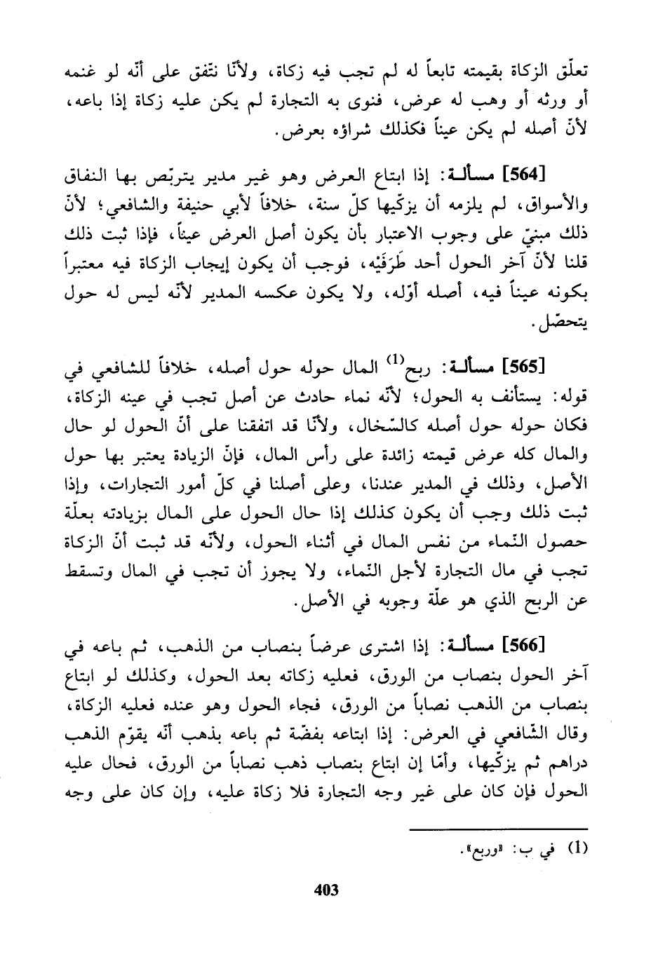 [565] مسألة: ربح المال حوله حول أصله، خلافاً للشافعي في قوله: يستأنف به الحول؛ لأنه نماء حادث عن أصل تجب في عينه الزكاة، فكان حوله حول أصله كالسخال؛ ولأنا قد اتفقنا على أن الحول لو حال والمال كله عرض قيمته زائدة على رأس المال، فإن الزيادة يعتبر بها حول الأصل، وذلك في المدير عندنا، وعلى أصلنا في كل أمور التجارات، وإذا ثبت ذلك وجب أن يكون كذلك إذا حال الحول على المال بزيادته بعلة حصول النماء من نفس المال في أثناء الحول؛ ولأنه قد ثبت أن الزكاة تجب في مال التجارة لأجل النماء ولا يجوز أن تجب في المال وتسقط عن الربح الذي هو علة وجوبه في الأصل.