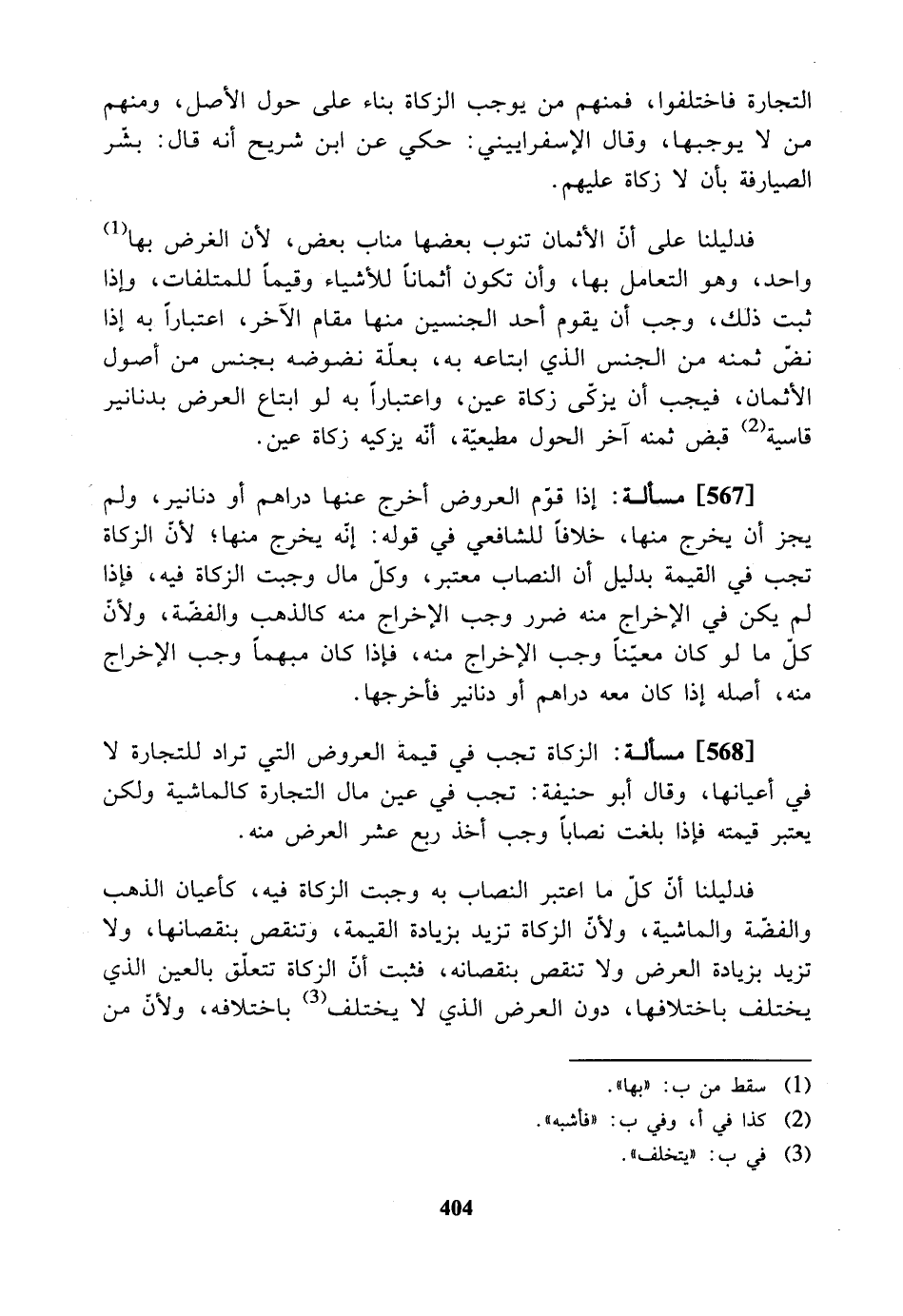 [568] مسألة: الزكاة تجب في قيمة العروض التي تراد للتجارة لا في أعيانها، وقال أبو حنيفة: تجب في عين مال التجارة، كالماشية ولكن يعتبر قيمته، فإذا بلغت نصابا وجب أخذ ربع عشر العرض منه، فدليلنا أن كل ما اعتبر النصاب به وجبت الزكاة فيه كأعيان الذهب والفضة والماشية، ولأن الزكاة تزيد بزيادة القيمة وتنقص بنقصانها، ولا تزيد بزيادة العرض ولا تنقص بنقصانه، فثبت أن الزكاة تتعلق بالعين الذي يختلف باختلافها، دون العرض الذي لا يختلف باختلافه،