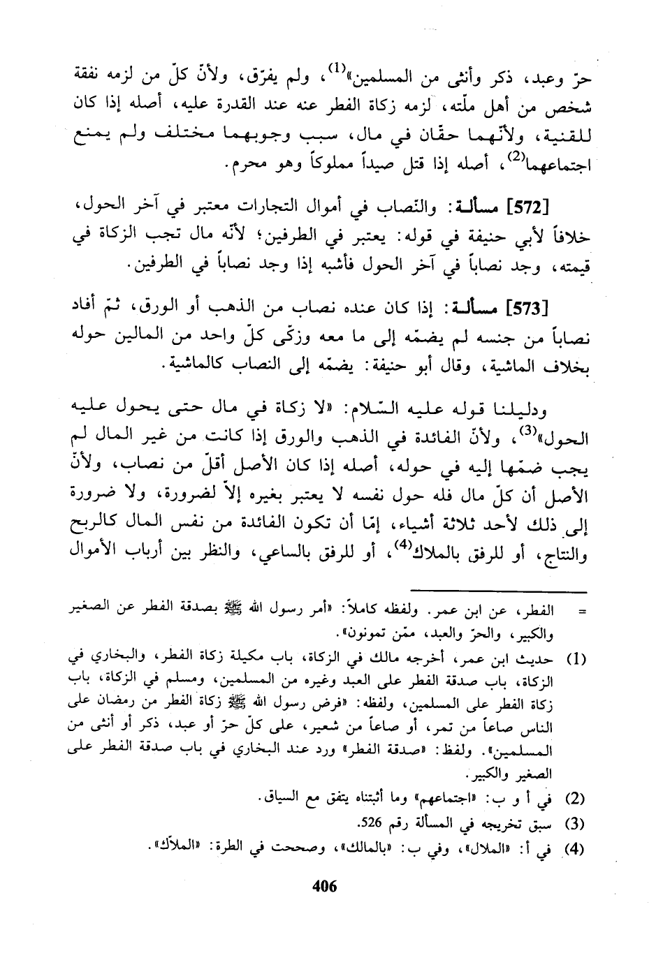 [572] مسألة: والنصاب في أموال التجارات معتبر في آخر الحول. خلافاً لأبي حنيفة، في قوله: يعتبر في الطرفين؛ لأنه مال تجب الزكاة في قيمته، وجد نصاباً في آخر الحول، فأشبه إذا وجد نصاباً في الطرفين.