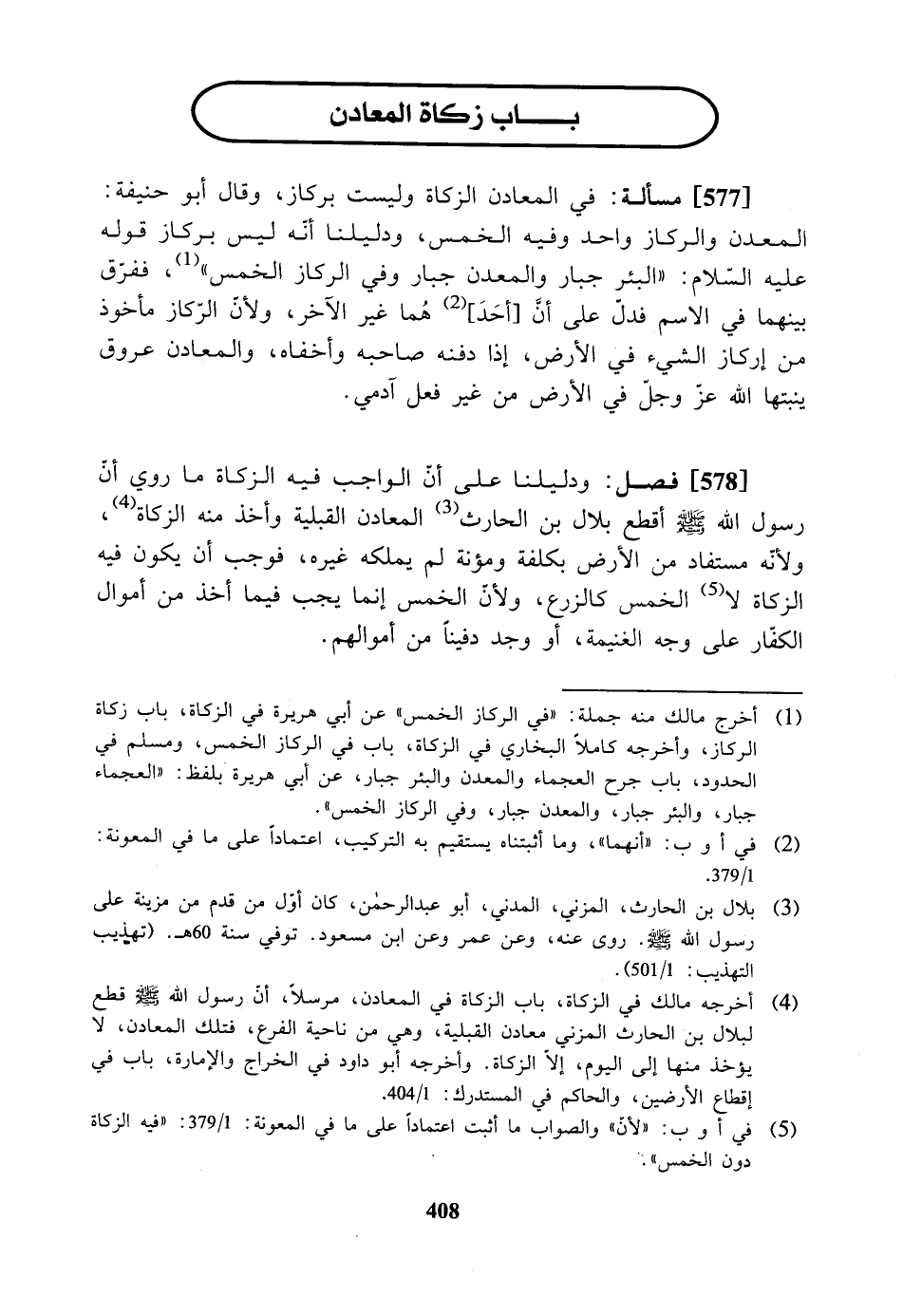 [578] (فصل): ودليلنا على أن الواجب فيه الزكاة ما روي (أن رسول الله - صلى الله عليه وسلم - أقطع بلال بن الحارث المعادن القبلية وأخذ منه الزكاة)، ولأنه مستفاد من الأرض بكلفة ومؤونة لم يملكه غيره، فوجب أن يكون فيه الزكاة، لا الخمس كالزرع؛ ولأن الخمس إنما يجب فيما أخذ من أموال الكفار على وجه الغنيمة، أو وجد دفينا من أموالهم.