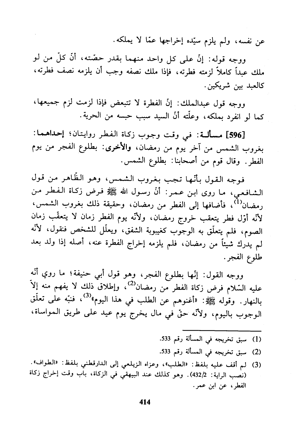 [596] مسألة: في وقت وجوب زكاة الفطر روايتان: إحداهما: بغروب الشمس من آخر يوم من رمضان. والأخرى: بطلوع الفجر من يوم الفطر، وقال قوم من أصحابنا: بطلوع الشمس. فوجه القول بأنها تجب بغروب الشمس، وهو الظاهر من قول الشافعي، ما روى ابن عمر أن رسول الله - صلى الله عليه وسلم - فرض زكاة الفطر من رمضان)، فأضافها إلى الفطر من رمضان، وحقيقة ذلك بغروب الشمس؛ لأنه أول فطر يتعقب خروج رمضان، ولأن يوم الفطر زمان لا يتعقب زمان الصوم، فلا يتعلق به الوجوب كغيبوبة الشفق، ويعلل للشخص فنقول: لأنه لم يدرك شيئا من رمضان، فلم يلزمه إخراج الفطرة عنه، أصله إذا ولد بعد طلوع الفجر، ووجه القول: أنها بطلوع الفجر، وهو قول أبي حنيفة: ما روي أنه عليه السلام، فرض زكاة الفطر من رمضان، وإطلاق ذلك لا يفهم منه إلا بالنهار، وقوله - صلى الله عليه وسلم - (أغنوهم عن الطلب في هذا اليوم)، فنّبه على تعلق الوجوب باليوم، ولأنه حق في مال يخرج يوم عيد على طريق المواساة،