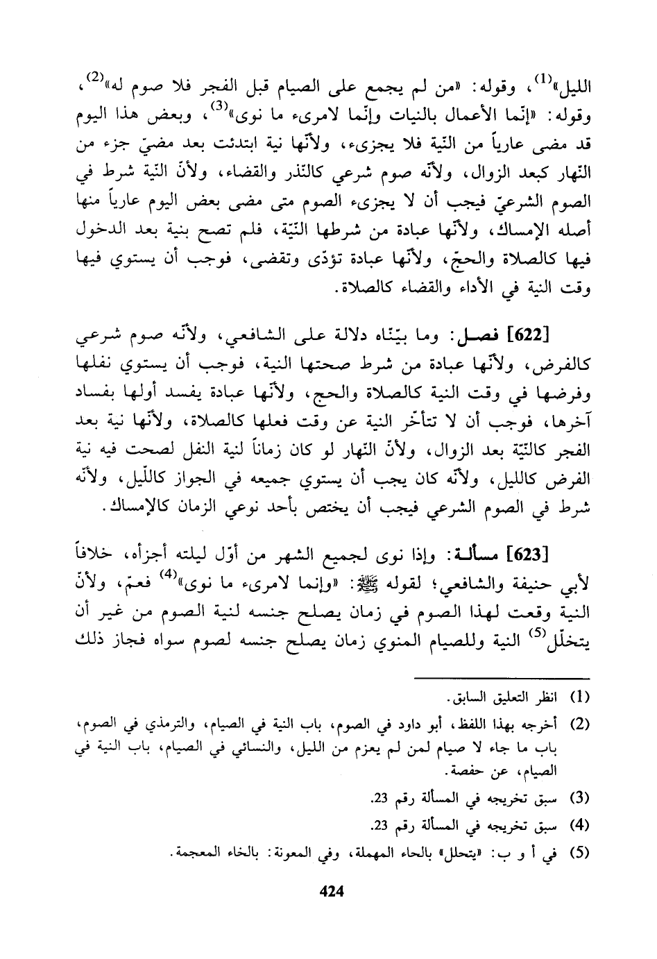 [623] مسألة: وإذا نوى لجميع الشهر من أول ليله أجزأه. خلافاً لأبي حنيفة والشافعي. لقوله - صلى الله عليه وسلم -: (وإنما لامرئ ما نوى)، فعم، ولأن النية وقعت لهذا الصوم في زمان يصلح جنسه لنية الصوم من غير أن يتخلل النية، وللصيام المنوي زمان يصلح جنسه لصوم سواه، فجاز ذلك،