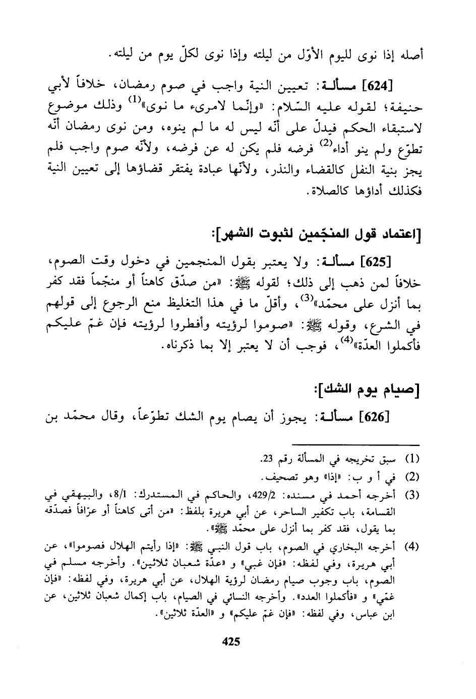 [625] مسألة: ولا يعتبر بقول المنجمين في دخول وقت الصوم، خلافاً لمن ذهب إلى ذلك، لقوله - صلى الله عليه وسلم -: (من صدق كاهنا أو منجما فقد كفر بما أنزل على محمد)، وأقل ما في هذا التغليظ منع الرجوع إلى قولهم في الشرع، وقوله - صلى الله عليه وسلم - (صوموا لرؤيته وأفطروا لرؤيته، فإن غم عليكم فأكملوا العدة)، فوجب أن لا يعتبر إلا بما ذكرناه.