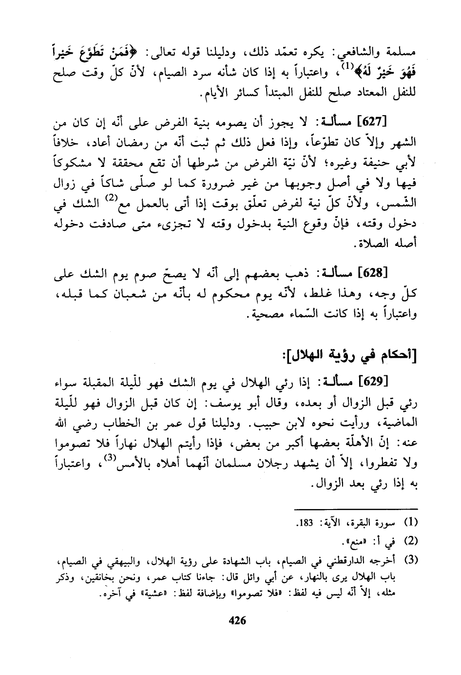 [629] مسألة: إذا رئي الهلال في يوم الشك فهو لليلة المقبلة، سواء رئي قبل الزوال أو بعده، وقال أبويوسف إن كان قبل الزوال فهو لليلة الماضية ورأيت نحوه لابن حبيب. ودليلنا قول عمر ابن الخطاب - رضي الله عنه -: (إن الأهلة بعضها أكبر من بعض فإذا رأيتم الهلال نهاراً فلا تصوموا ولا تفطروا إلا أن يشهد رجلان مسلمان أنهما أهلاه بالأمس) واعتبار به إذا رئي بعد الزوال.