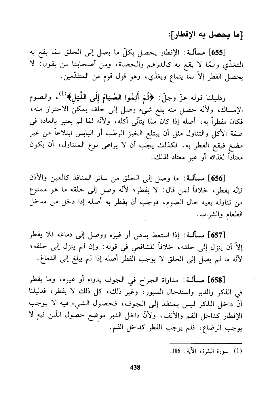 [655] مسألة: الإفطار يحصل بكل ما يصل إلى الحلق، مما يقع به التغذي ومما لا يقع به، كالدرهم والحصاة، ومن أصحابنا من يقول: لا يحصل الفطر إلا بما يَنْماعُ ويغذي وهو قول قوم من المتقدمين. ودليلنا قوله عز وجل: {ثم أتموا الصيام إلى الليل}، والصوم الإمساك، ولأنه حصل منه بلع شيئًا وصل إلى حلقه يمكن الاحتراز منه، فكان مفطراً به، أصله إذا كان مما يتأتىَّ أكله. ولأنه لما لم يعتبر بالعادة في صفة الأكل والتناول، مثل أن يبتلع الخبز الرطب أو اليابس ابتلاعا من غير مضغ فيقع الفطر به، فكذلك يجب أن لا يراعى نوع المتناول أن يكون معتادا الغذاء به، أو غير معتاد لذلك.