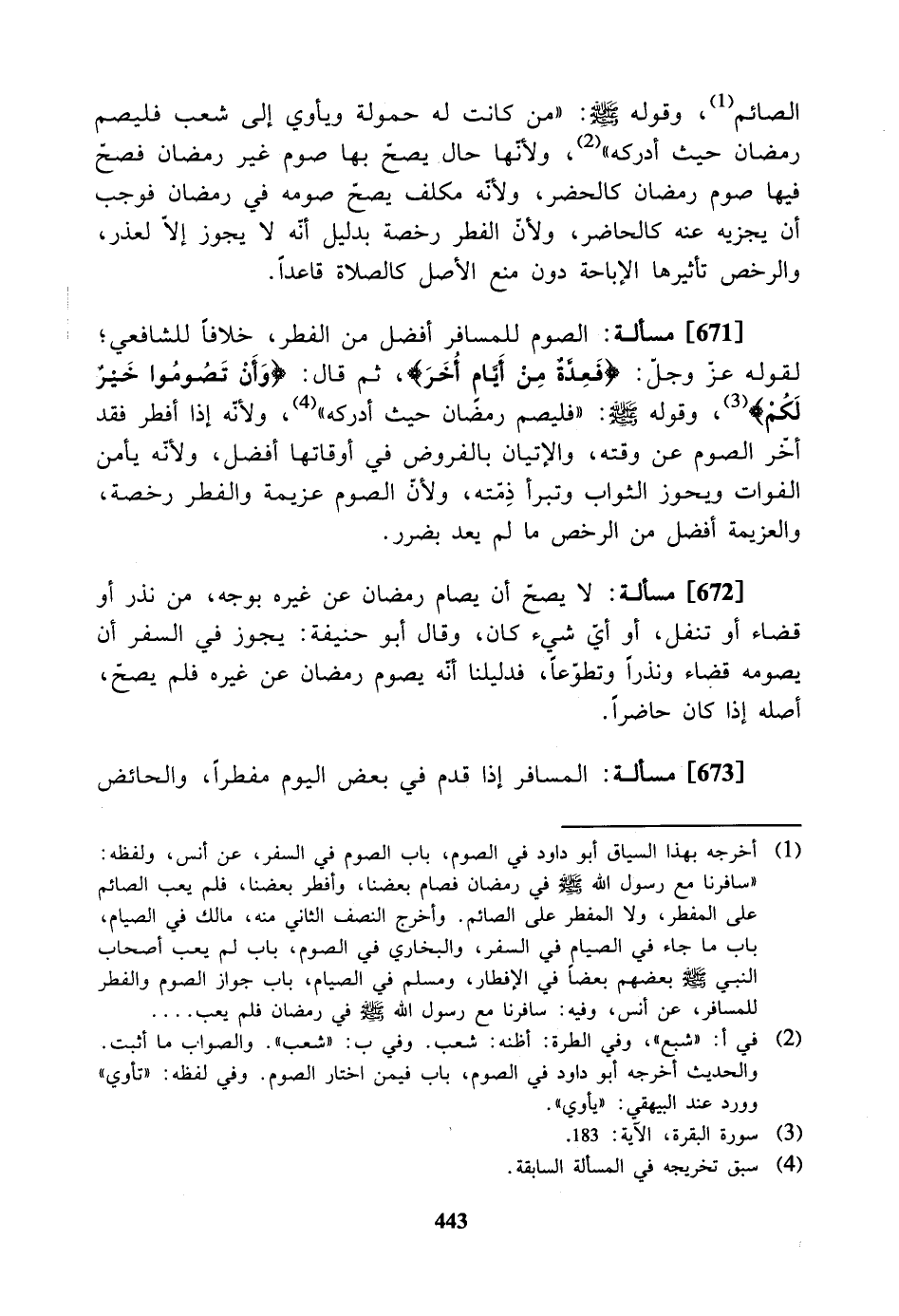 [671] مسألة: الصوم للمسافر أفضل من الفطر. خلافاً للشافعي لقوله عز وجل: {فعدة من أيام أخر} ثم قال: {وأن تصوموا خير لكم} وقوله: (فليصم رمضان حيث أدركه) ولأنه إذا أفطر فقد أخّر الصوم عن وقته، والإتيان بالفروض في أوقاتها أفضل؛ ولأنه يأمن الفوات ويحوز الثواب وتبرأ ذمته؛ ولأن الصوم عزيمة والفطر رخصة، والعزيمة أفضل من الرخصة ما لم تَعْدُ بضرر.