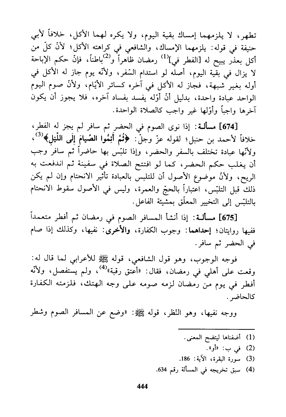 [674] مسألة: إذا نوى الصوم في الحضر، ثم سافر، لم يجز له الفطر. خلافاً لأحمد بن حنبل، لقوله عز وجل: {ثم أتموا الصيام إلى الليل}، ولأنها عبادة تختلف بالسفر والحضر، وإذا تلبس بها حاضراً، ثم سافر، وجب أن يغلب حكم الحضر، كما لوا فتتح الصلاة في سفينة ثم اندفعت به الريح؛ ولأن موضوع الأصول أن للتلبس بالعبادة تأثير الانحتام وإن لم يكن ذلك قبل التلبس، اعتباراً بالحج والعمرة، وليس في الأصول سقوط الانحتام بالتلبس إلى التخيير المعلق بمشيئة الفاعل.