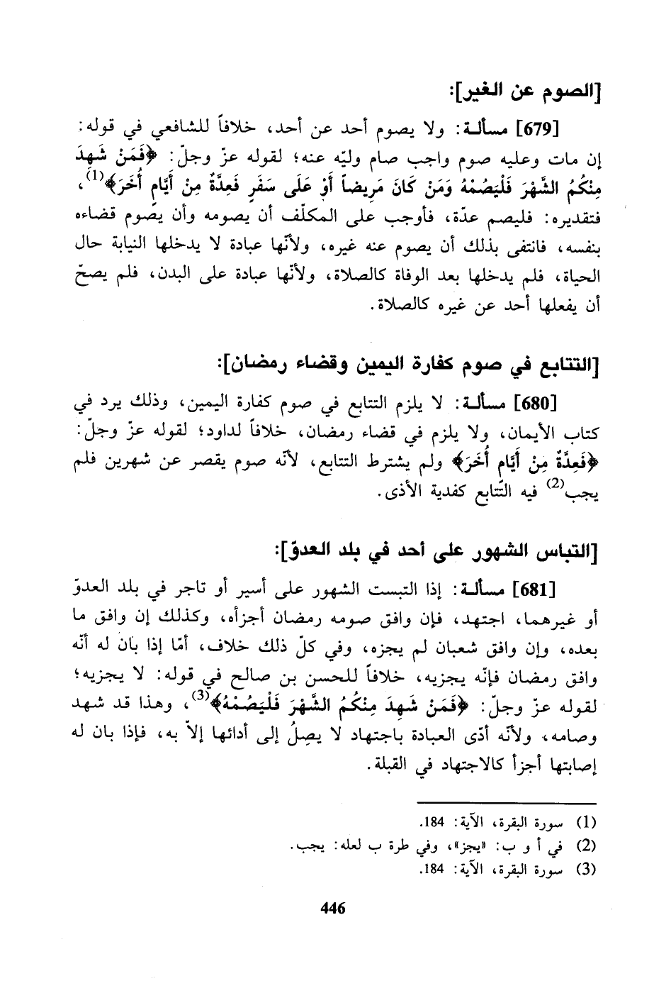 [680] مسألة: لا يلزم التتابع في صوم كفارة اليمين، وذلك يرد في كتاب الأيمان، ولا يلزم في قضاء رمضان، خلافاً لداود، لقوله عز وجل: {فعدة من أيام أخر} ولم يشترط التتابع؛ ولأنه صوم يقصر عن شهرين فلم يجب فيه التتابع كفدية الأذى.