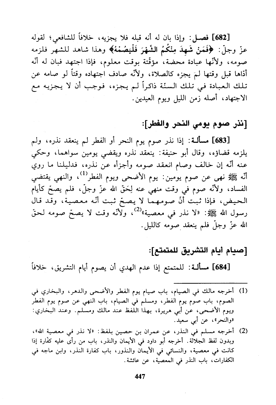 [683] مسألة: إذا نذر صوم يوم النحر أو الفطر لم ينعقد نذره، ولم يلزمه قضاؤه، وقال أبو حنيفة: ينعقد نذره ويقضي يومين سواهما، وحكي عنه أنه إن خالف وصام انعقد صومه وأجزأه عن نذره، فدليلنا ما روي أنه - صلى الله عليه وسلم -: (نهى عن صوم يومين يوم الأضحى ويوم الفطر)، والنهي يقتضي الفساد؛ ولأنه صوم في وقت منهي عنه لِحقِّ الله عز وجل، فلم يصح كأيام الحيض، فإذا ثبت أن صومهما لا يصح ثبت أنه معصية، وقد قال رسول الله - صلى الله عليه وسلم - (لا نذر في معصية)؛ ولأنه وقت لا يصح صومه لحق الله عز وجل، فلم ينعقد صومه كالليل.