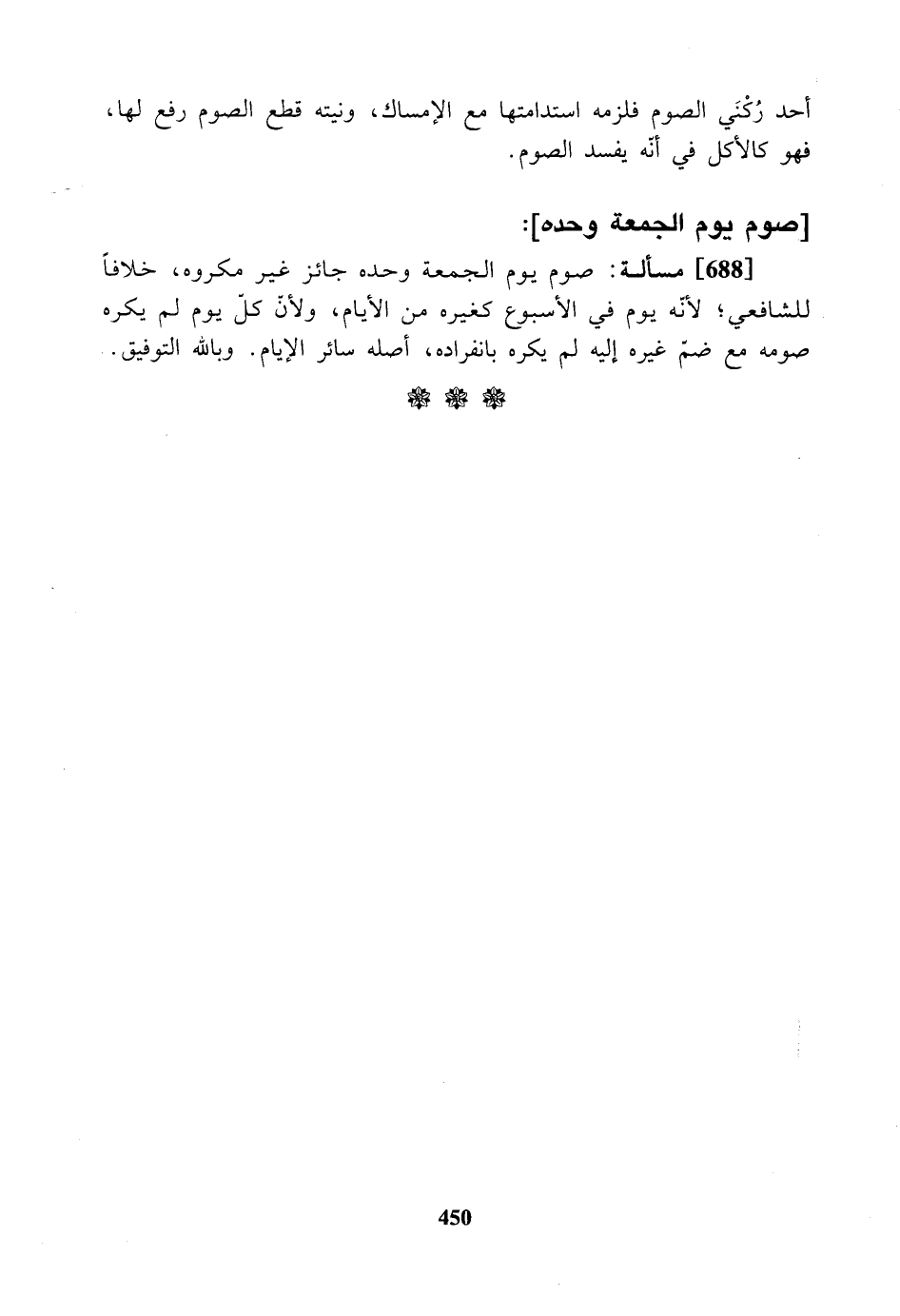 [688] مسألة: صوم يوم الجمعة وحده جائز غير مكروه. خلافاً للشافعي؛ لأنه يوم في الأسبوع كغيره من الأيام؛ ولأن كل يوم لم يكره صومه مع ضم غيره إليه لم يكره بانفراده، أصله سائر الأيام. -وبالله التوفيق-.
