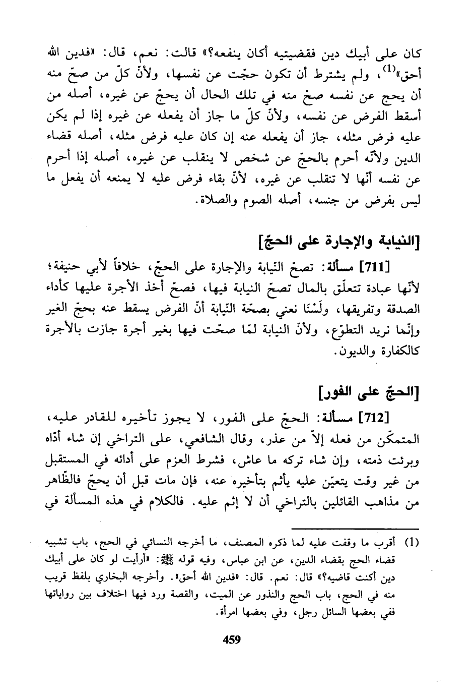 [712] مسألة: الحجّ على الفور، لا يجوز تأخيره للقادر عليه، المتمكن من فعله إلاّ من عذر، وقال الشافعي، على التراخي إن شاء أداه وبرئت ذمته، وإن شاء تركه ما عاش، فشرط العزم على أدائه في المستقبل من غير وقت يتعيّن عليه يأثم بتأخيره عنه، فإذا مات قبل أن يحجّ فالظّاهر من مذاهب القائلين بالتراخي أن لا إثم عليه. فالكلام في هذه المسالة في