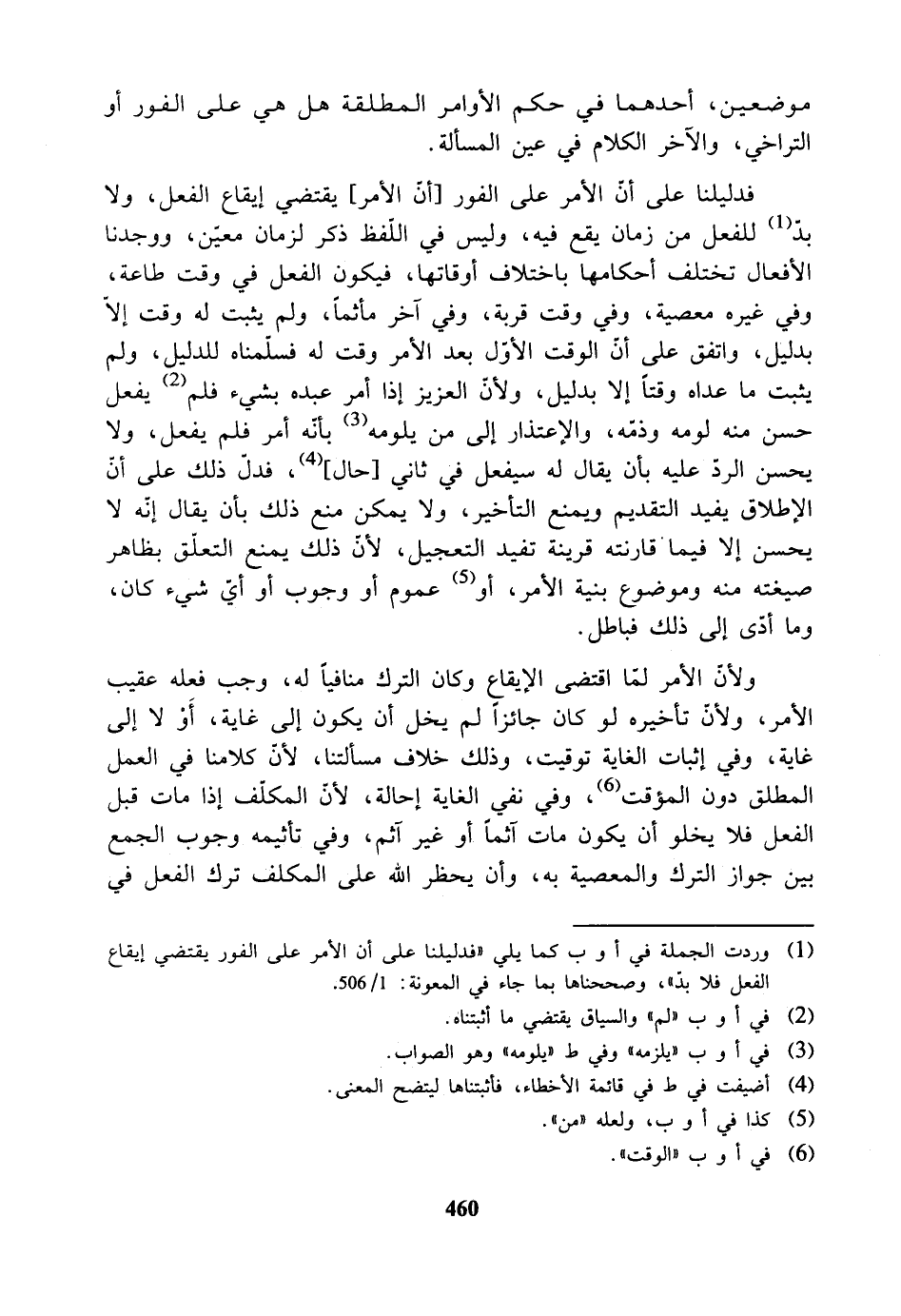موضعين، أحدهما في حكم الأوامر المطلقة هل هي على الفور أو التراخي، والآخر الكلام عن عين المسألة. فدليلنا على أنّ الأمر على الفور أنّ الأمر يقتضي إيقاع الفعل، ولا بد للفعل من زمان يقع فيه، وليس في اللّفظ ذكر لزمان معيّن، ووجدنا الأفعال تختلف أحكامها باختلاف أوقاتها، فيكون الفعل في وقت طاعة، وفي غيره معصية، وفي وقت قربة، وفي آخر مأثماً، لم يثبت له وقت إلاّ بدليل، واتفق على أنّ الوقت الأوْل بعد الأمر وقت له فسلّمناه للدليل، ولم يثبت ما عداه وقتاً إلا بدليل، ولأنّ العزيز إذا أمر عبده بشيء فلم يفعل حسن منه لومه وذمّه، والاعتذار إلى من يلومه بأنّه أمر فلم يفعل، ولا يحسن الردّ عليه بأن يقال له سيفعل في ثاني حال، فدلّ ذلك على أنّ الإطلاق يفيد التقديم ويمنع التأخير، ولا يمكن منع ذلك بأن يقال إنّه لا يحسن إلا فيما قارنته قرينة تفيد التعجيل، لأن ذلك يمنع التعلق بظاهر صيغته منه وموضوع بنية الأمر أو عموم أن وجوب أو أيّ شيء كان، وما أدّى إلى ذلك فباطل. ولأنّ الأمر لمّا اقتضى الإيقاع وكان الترك منافياً له، وجب فعله عقيب الأمر، ولأنّ تأخيره لو كان جائزاً لم يخل أن يكون إلى غاية، أوْ لا إلى غاية، وفي إثبات الغاية توقيت، وذلك خلاف مسألتنا، لأنّ كلامنا في العمل المطلق دون المؤقت، وفي نفي الغاية إحالة، لأنّ المكلّف إذا مات قبل الفعل فلا يخلو أن يكون مات آثماً أو غير آثم، وفي تأثيمه وجوب الجمع بين جواز الترك، والمعصية به، وأن يحظر الله على المكلف ترك الفعل في