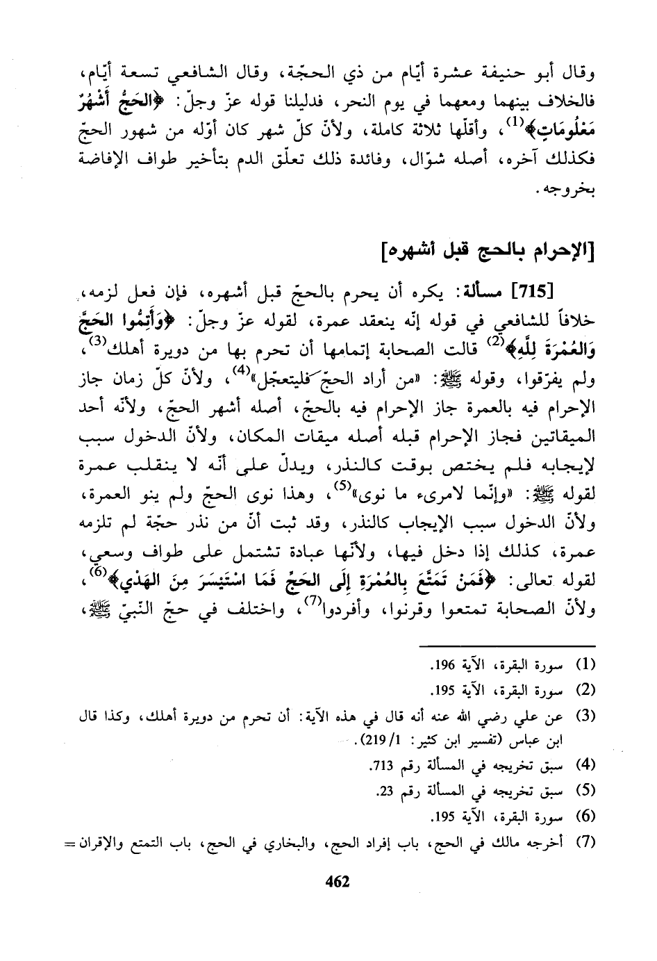 [715] مسألة: يكره أن يحرم بالحج قبل أشهره، فإن فعل لزمه، خلافاً للشافعي في قوله: إنه ينعقد عمرة. لقوله عز وجل: {وأتموا الحج والعمرة لله}. قالت الصحابة: (إتمامها أن تحرم بها من دويرة أهلك) ولم يفرقوا وقوله - صلى الله عليه وسلم -: (من أراد الحج فليتعجل). ولأن كل زمان جاز الإحرام فيه بالعمرة جاز الإحرام فيه بالحج، أصله أشهر الحج، ولأنه أحد الميقاتين فجاز الإحرام قبله، أصله ميقات المكان، ولأن الدخول سبب لإيجابه فلم يختص بوقت كالنذر ويدل على أنه لا ينقلب عمرة قوله - صلى الله عليه وسلم -: (وإنما لامرئ ما نوى)، وهذا نوى الحج ولم ينو العمرة، ولأن الدخول سبب الإيجاب كالنذر، وقد ثبت أن من نذر حجة لا تلزمه عمرة، كذلك إذا دخل فيها، ولأنها عبادة تشتمل على طواف وسعي لقوله تعالى: {فمن تمتع بالعمرة إلى الحج فما استيسر من الهدي}، ولأن الصحابة تمتعوا وقرنوا وأفردوا، واختلف في حج النبي - صلى الله عليه وسلم -