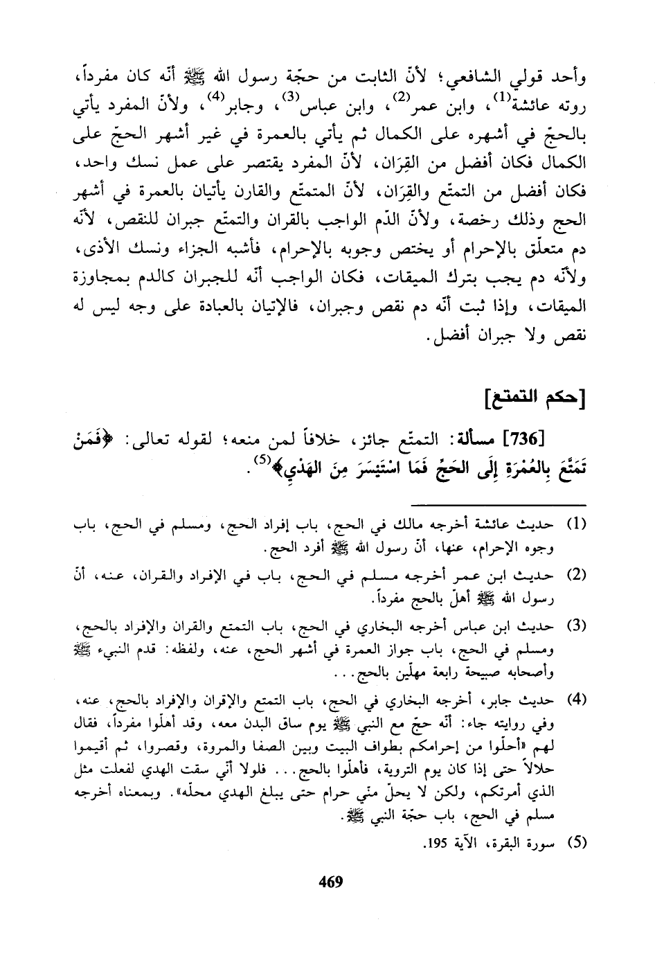[736] مسألة: التمتع جائز، خلافاً لمن منعه، لقوله تعالى: {فمن تمتع بالعمرة إلى الحج فما استيسر من الهدي}.