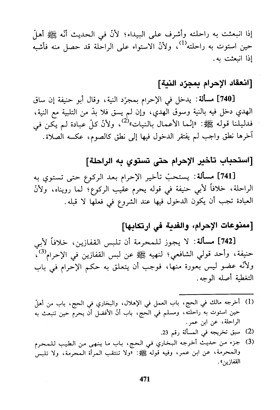 [741] مسألة: يستحب تأخير الإحرام بعد الركوع حتى تستوي به الراحلة. خلافاً لأبي حنيفة في قوله: يحرم عقيب الركوع لما رويناه ولأن العبادة يجب أن يكون الدخول فيها عند الشروع في فعلها لا قبله.