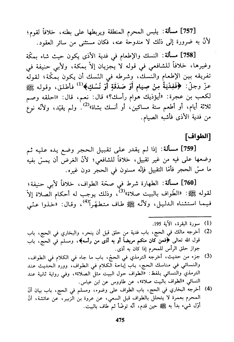 [760] مسألة: الطهارة شرط في صحة الطواف، خلافاً لأبي حنيفة، لقوله - صلى الله عليه وسلم -: (الطواف بالبيت صلاة) وذلك يوجب له أحكام الصلاة إلا فيما استثناه الدليل، ولأنه - صلى الله عليه وسلم - طاف متطهراً، وقال: (خذوا عني