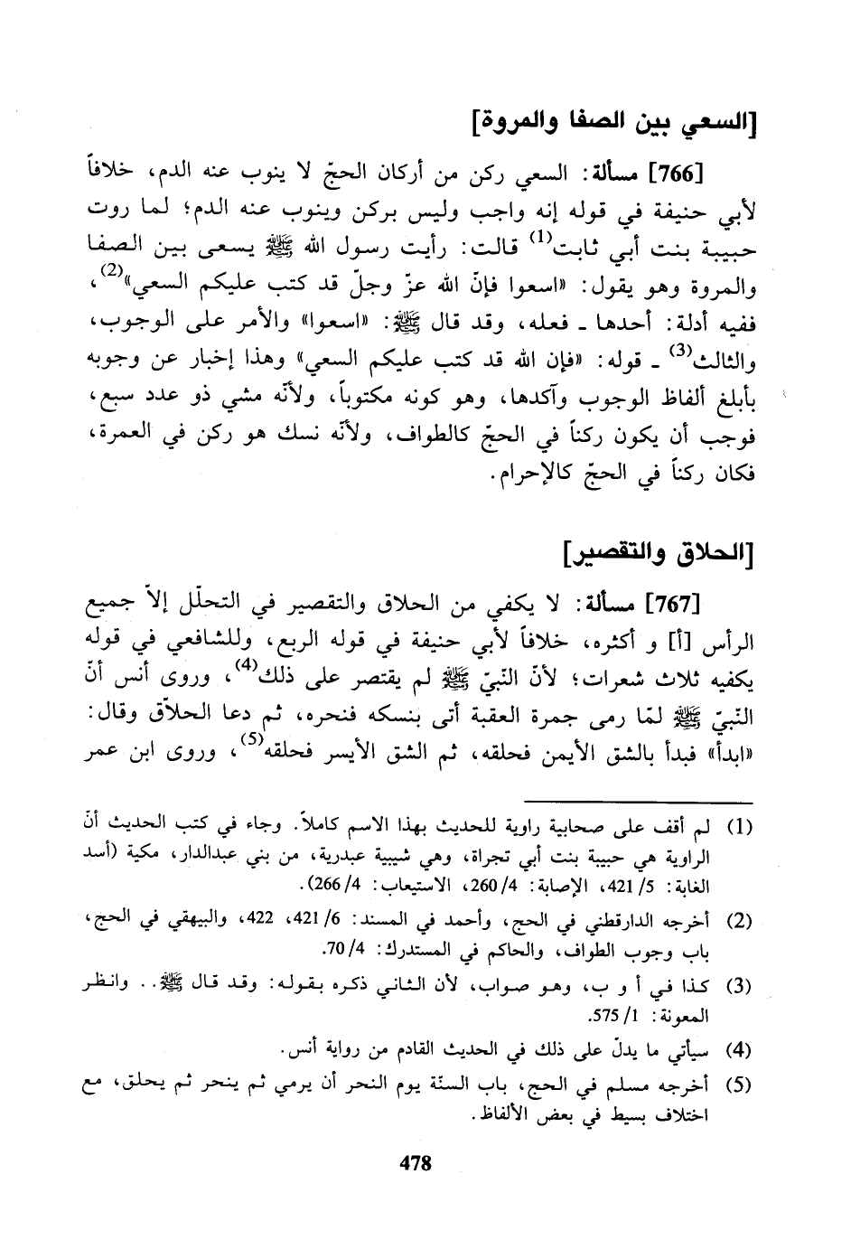 [766] مسألة: السعي ركن من أركان الحج لا ينوب عنه الدم، خلافاً لأبي حنيفة في قوله: إنه واجب وليس بركن وينوب عنه الدم، لما روت حبيبة بنت أبي ثابت قالت: (رأيت رسول الله - صلى الله عليه وسلم - يسعى بين الصفا، والمروة وهو يقول: اسعوا فإن الله عز وجل قد كتب عليكم السعي) ففيه أدلة: أحدها: فعله، وقد قال - صلى الله عليه وسلم -: (اسعوا) والأمر على الوجوب، والثالث: قوله: (فإن الله قد كتب عليكم السعي) وهذا إخبار عن وجوبه بأبلغ ألفاظ الوجوب وآكدها، وهو كونه مكتوباً، ولأنه مشي ذو عدد سبع، فوجب أن يكون ركناً في الحج كالطواف، ولأنه نسك هو ركن في العمرة، فكان ركناً في الحج كالإحرام.