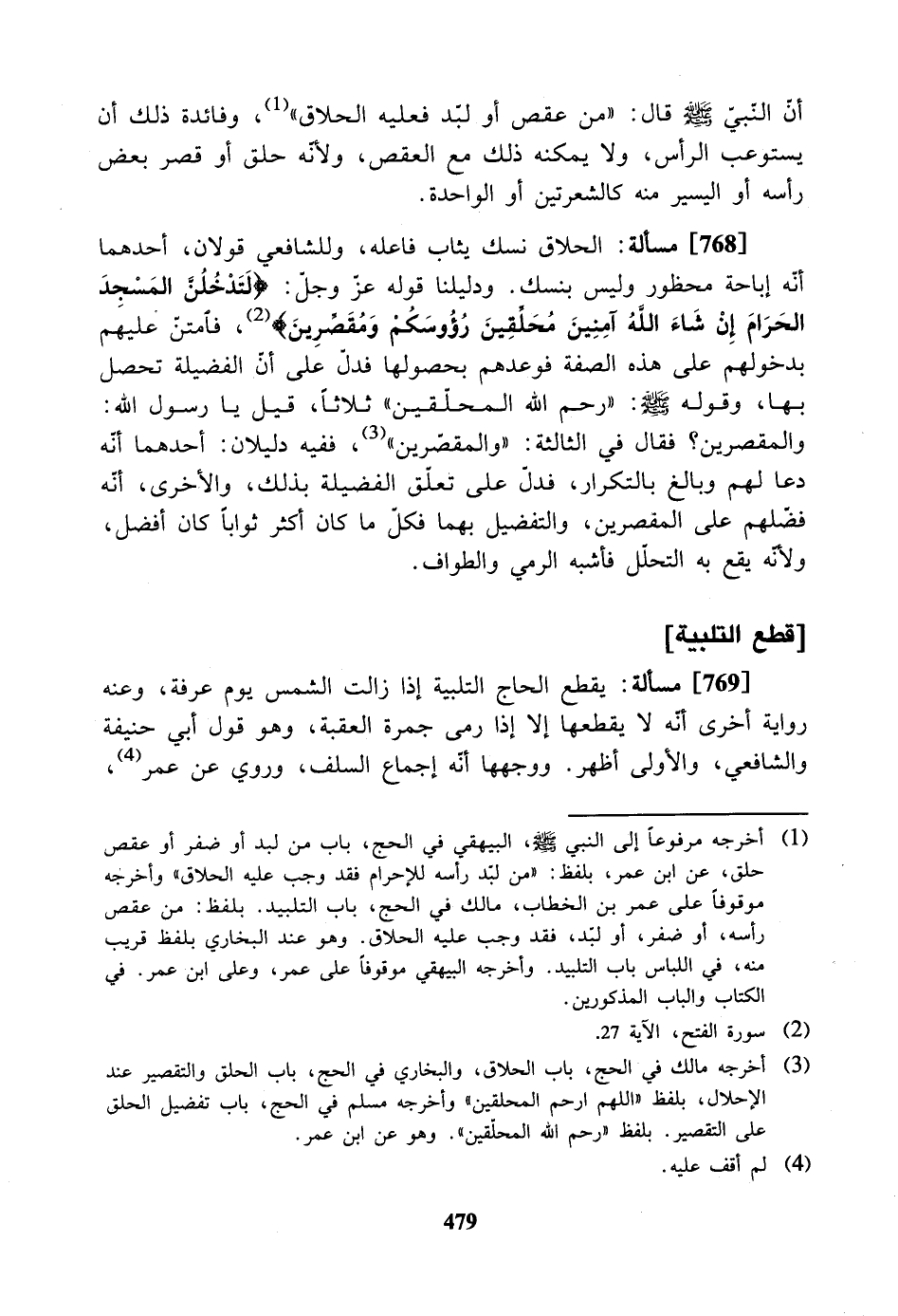 [768] مسألة: الحلاق نسك يثاب فاعله، وللشافعي قولان أحدهما أنه إباحة محظور وليس بنسك ودليلنا قوله عز وجل: {لتدخلن المسجد الحرام إن شاء الله آمنين محلقين رءوسكم ومقصرين} فامتن عليهم بدخولهم على هذه الصفة فوعدهم بحصولها، فدل على أن الفضيلة تحصل بها، وقوله - صلى الله عليه وسلم -: (رحم الله المحلقين ثلاثاً قيل يا رسول الله: والمقصرين؟ فقال في الثالثة: و"المقصرين"، ففيه دليلان، أحدهما: أنه دعا لهم وبالغ بالتكرار، فدل على تعلق الفضيلة بذلك، والآخر: أنه فضلهم على المقصرين، والتفضيل بهما فكل ما كان أكثر ثواباً كان أفضل، ولأنه يقع به التحلل فأشبه الرمي والطواف.