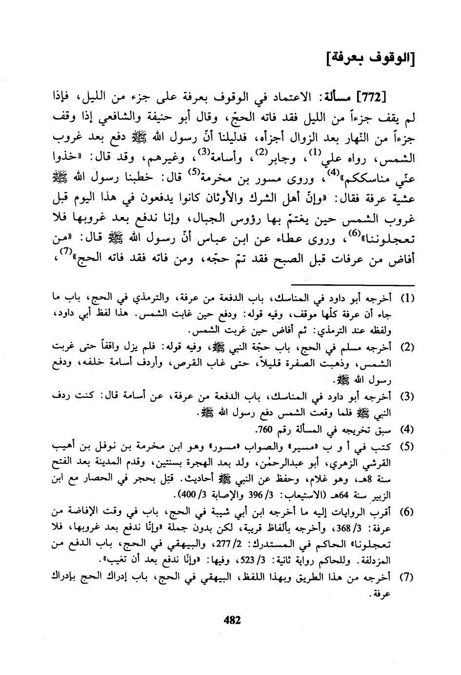 [772] مسألة: الاعتماد في الوقوف بعرفة على جزء من الليل، فإذا لم يقف جزءاً من الليل فقد فاته الحج، وقال أبو حنيفة، والشافعي إذا وقف جزءاً من النهار بعد الزوال أجزأه، فدليلنا أن رسول الله - صلى الله عليه وسلم - دفع بعد غروب الشمس، رواه علي، وجابر، وأسامة، وغيرهم وقد قال: (خذوا عني مناسككم). وروى مسور بن مخرمة قال خطبنا رسول الله - صلى الله عليه وسلم - عشية عرفة، فقال: (وإن أهل الشرك والأوثان كانوا يدفعون في هذا اليوم قبل غروب الشمس حين يغتّم بها رؤوس الجبال، وإنا ندفع بعد غروبها فلا تعجلوننا). وروى عطاء، عن ابن عباس، أن رسول الله - صلى الله عليه وسلم - قال: (من أفاض من عرفات قبل الصبح فقد تم حجه، ومن فاته فقد فاته الحج).