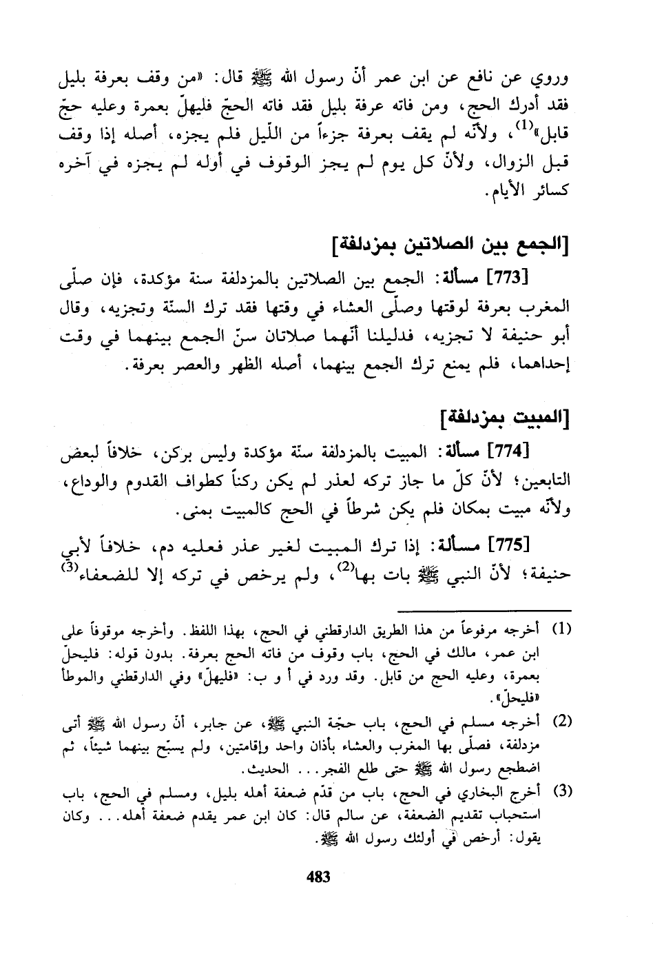 [774] مسألة: المبيت بالمزدلفة سنة مؤكدة وليس بركن، خلافاً لبعض التابعين؛ لأن كل ما جاز تركه لعذر لم يكن ركناً كطواف القدوم والوداع؛ ولأنه مبيت بمكان فلم يكن شرطاً في الحج كالمبيت بمنى.