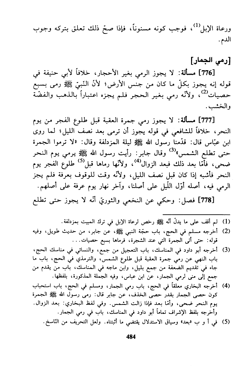 [777] مسألة: لا يجوز رمي جمرة العقبة قبل طلوع الفجر من يوم النحر، خلافاً للشافعي في قوله: يجوز أن ترمى بعد نصف الليل، لما روى ابن عباس قال قدّمنا رسول الله - صلى الله عليه وسلم - ليلة المزدلفة، وقال: (لا ترموا الجمرة حتى تطلع الشمس)، وقال جابر: (رأيت رسول الله - صلى الله عليه وسلم - يرمي يوم النحر ضحى، فأما بعد ذلك فبعد زوال الشمس)، ولأنها رماها بعد طلوع الفجر يوم النحر، فأشبه إذا كان قبل نصف الليل، ولأنه وقت للوقوف بعرفة فلم يجز الرمي فيه، أصله أول الليل على أصلنا، وآخر نهار يوم عرفة على أصلهم.