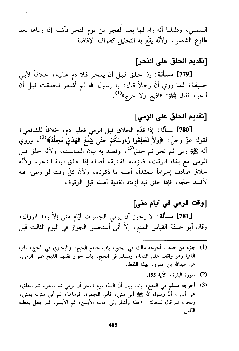 [779] مسألة: إذا حلق قبل أن ينحر فلا دم عليه، خلافاً لأبي حنيفة، لما روي أن رجلاً قال: يا رسول الله، لم أشعر فحلقت قبل أن أنحر، فقال - صلى الله عليه وسلم - (اذبح ولا حرج).