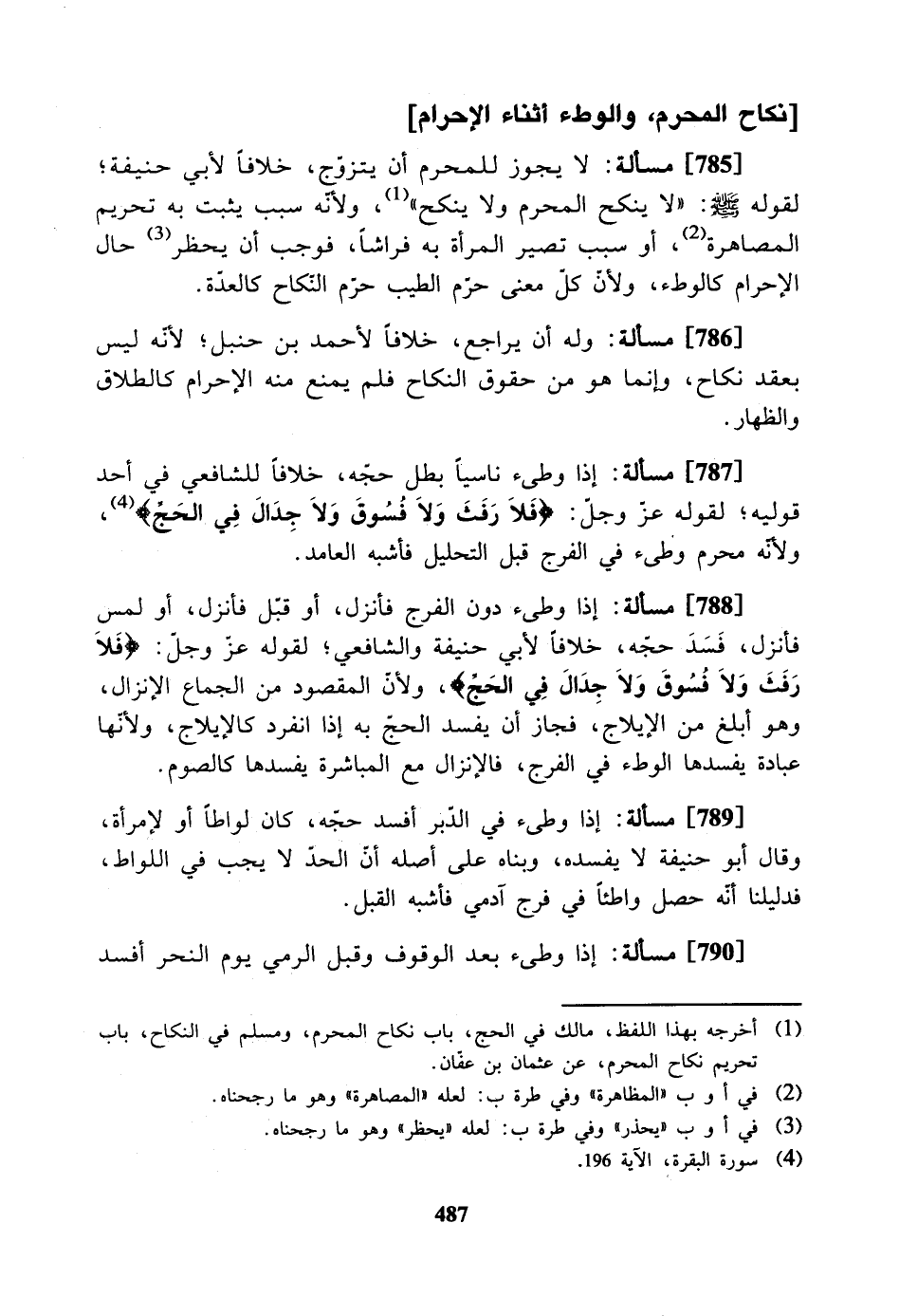 [788] مسألة: إذا وطئ دون الفرج فأنزل، أو قبل فأنزل، أو لمس فأنزل، فسد حجه، خلافاً لأبي حنيفة، والشافعي، لقوله عز وجل: {فلا رفث ولا فسوق ولا جدال في الحج}، ولأن المقصود من الجماع الإنزال، وهو أبلغ من الإيلاج، فجاز أن يفسد الحج به إذا انفرد كالإيلاج، ولأنها عبادة يفسدها الوطء في الفرج، فالإنزال مع المباشرة يفسدها كالصوم.