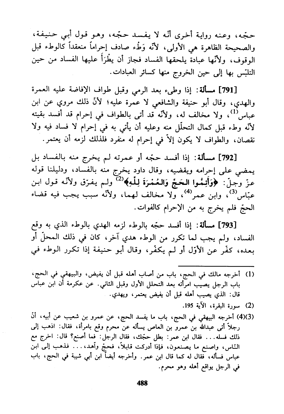 حجه، وعنه رواية أخرى أنه لا يفسد حجه، وهو قول أبي حنيفة، والصحيحة الظاهرة هي الأولى؛ لأنه وطء صادف إحراماً منعقداً كالوطء قبل الوقوف، ولأنها عبادة يلحقها الفساد فجاز أن يطرأ عليها الفساد من حين التلبس بها إلى حين الخروج منها كسائر العبادات.