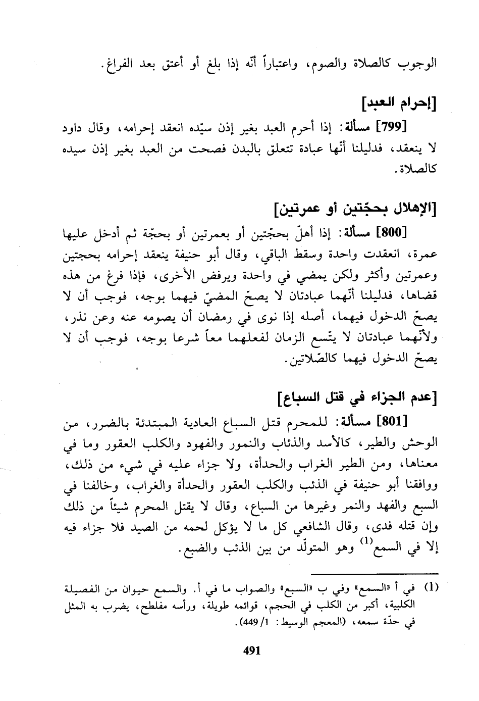 [801] مسألة: للمحرم قتل السباع العادية المبتدئة بالضرر، من الوحش والطير كالأسد والذئاب والنمور والفهود والكلب العقور وما في معناه ومن الطير الغراب والحداة ولا جزاء عليه في شيء من ذلك، ووافقنا أبو حنيفة في الذئب والكلب العقور والحدأة والغراب، وخالفنا في السبع والفهد والنمر وغيرها من السباع، وقال: لا يقتل المحرم شيئاً من ذلك وإن قتله فدى، وقال الشافعي: كل ما لا يؤكل لحمه من الصيد فلا جزاء فيه إلا في السمع؛ وهو المتولد من بين الذئب والضبع،
